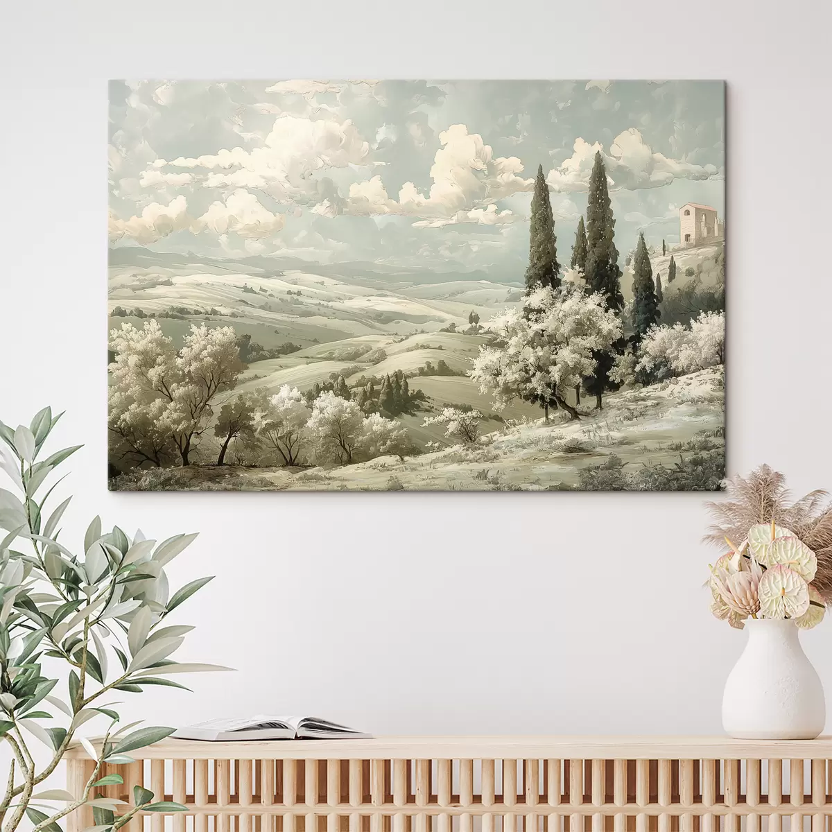 Peinture Paysage d'été, style vintage, couleurs pastel, dessin acrylique, château Art. s40084