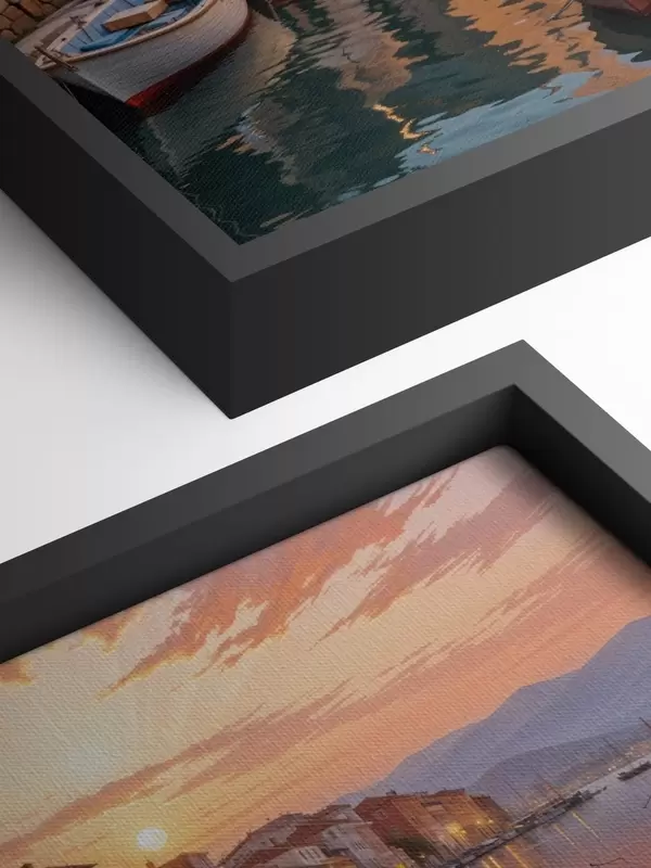 Peinture Ville côtière italienne au coucher du soleil, avec des bâtiments colorés bordant le front de mer et des bateaux flottant dans les eaux calmes Art. s40150