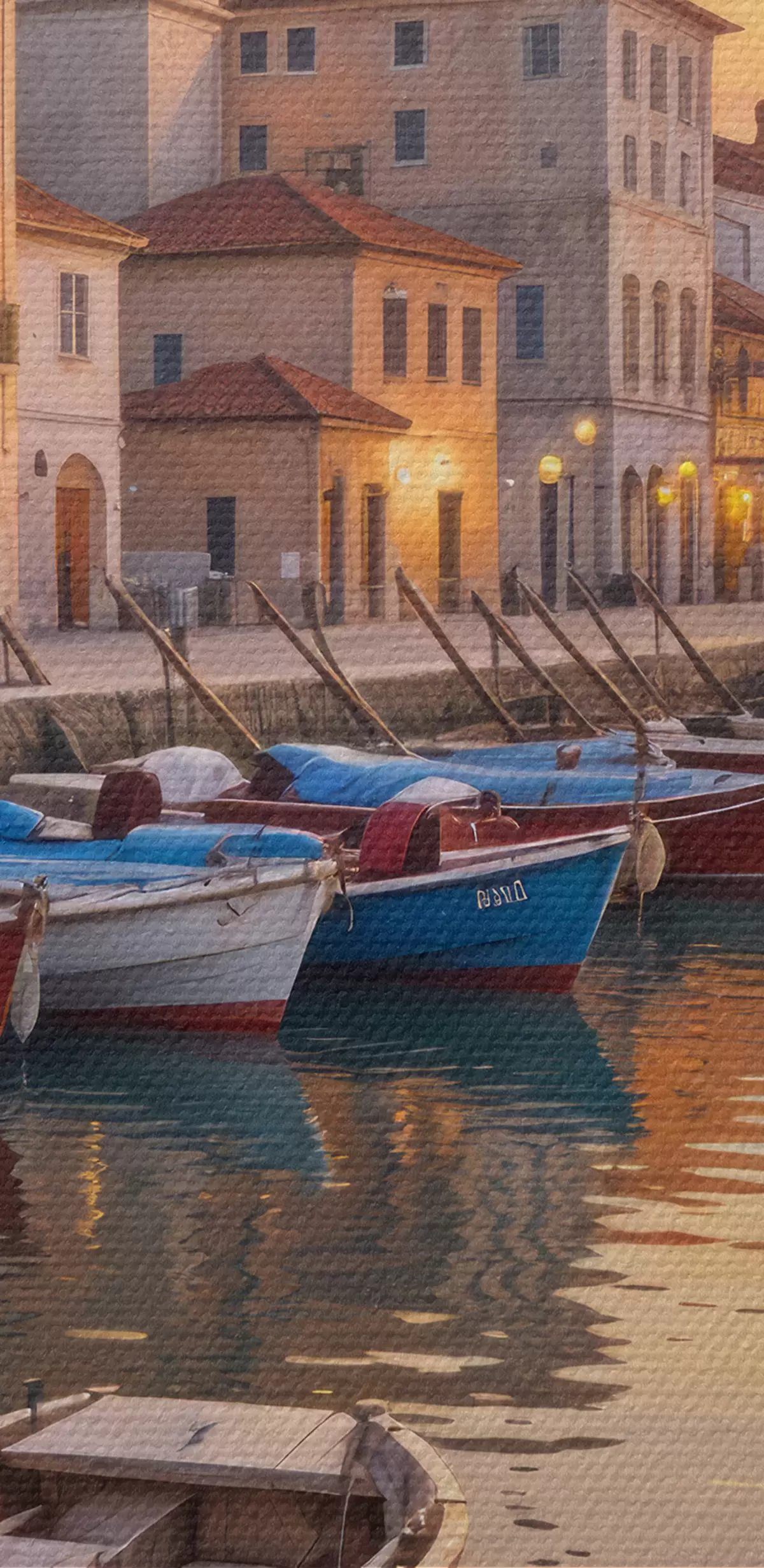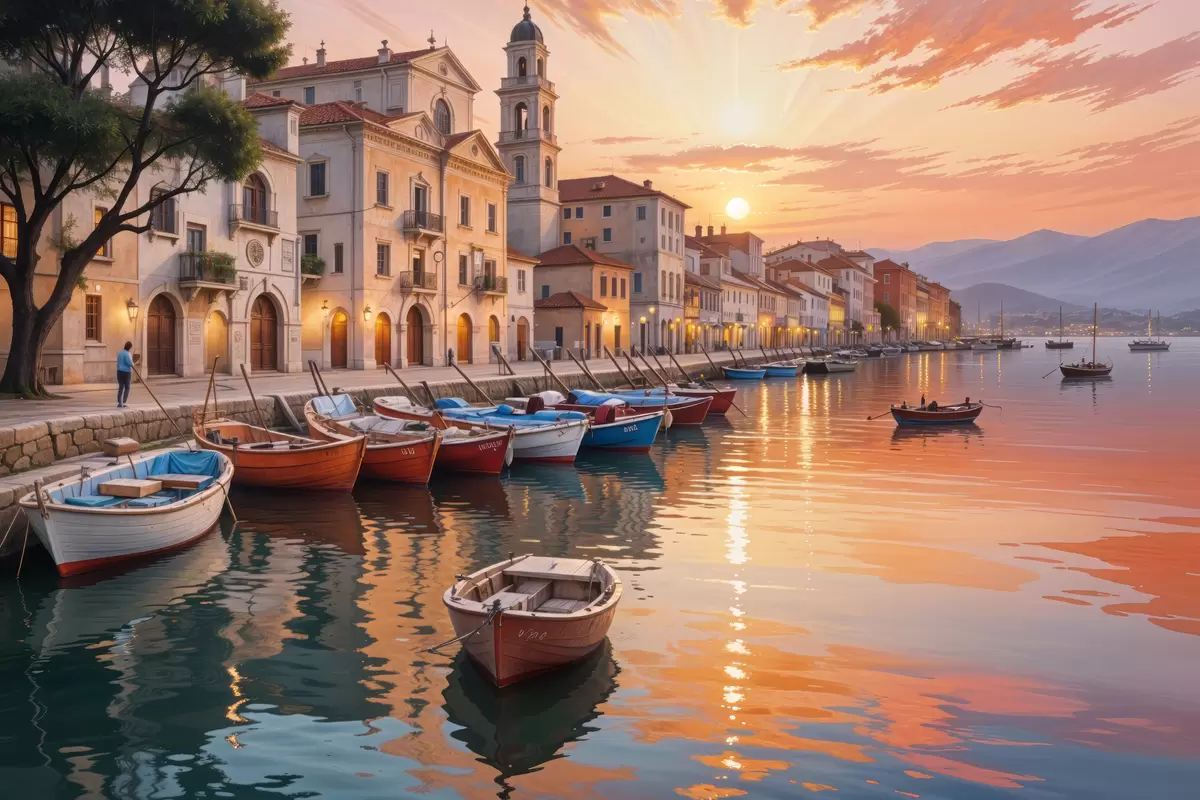 Peinture Ville côtière italienne au coucher du soleil, avec des bâtiments colorés bordant le front de mer et des bateaux flottant dans les eaux calmes Art. s40150