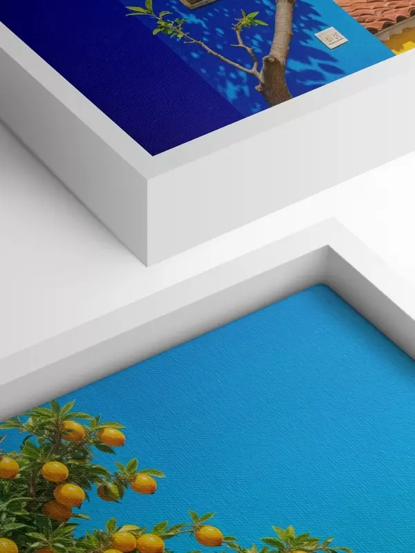 Peinture Un oranger aux fruits mûrs poussant sur un bâtiment avec un mur bleu et un toit de tuiles donnant sur l'océan Art. s40159