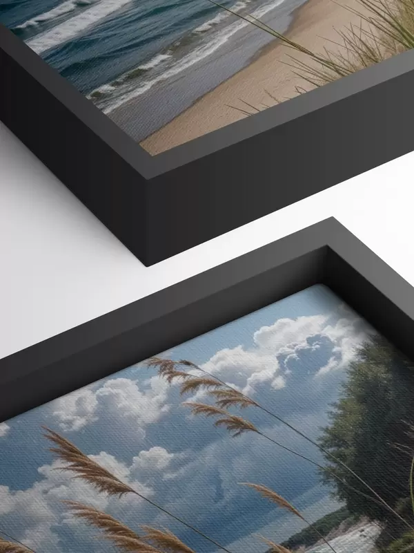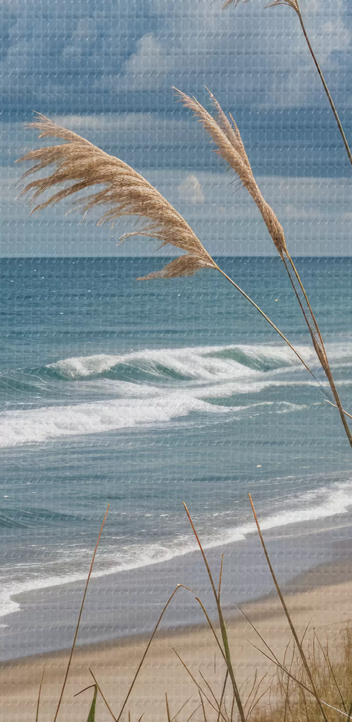 Peinture Une plage pittoresque avec de hautes herbes se balançant dans le vent, surplombant l'océan avec des vagues déferlantes et un ciel nuageux Art. s40161