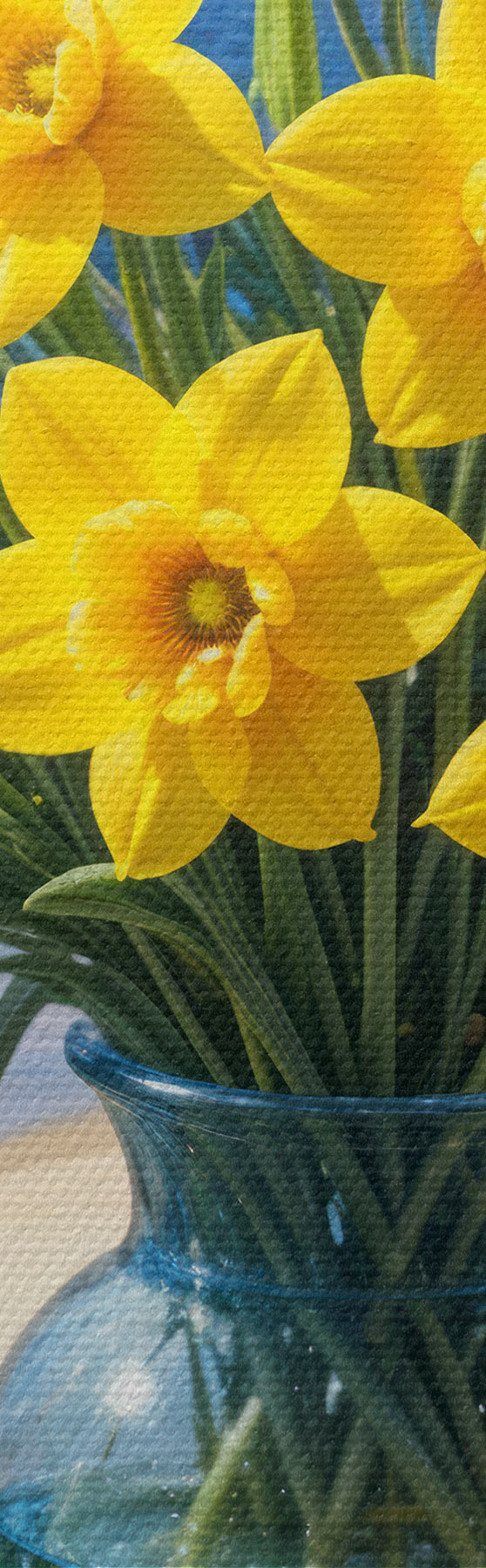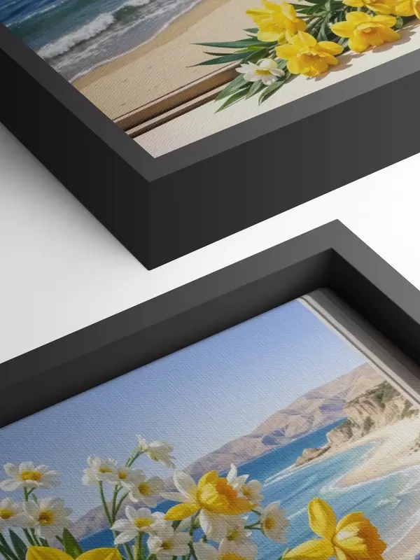 Peinture Un bouquet de jonquilles jaunes et de marguerites blanches dans un vase en verre sur un rebord de fenêtre donnant sur une plage et l'océan Art. s40171