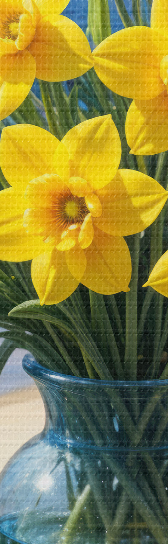 Peintures Un bouquet de jonquilles jaunes et de marguerites blanches dans un vase en verre sur un rebord de fenêtre donnant sur une plage et l'océan s40171