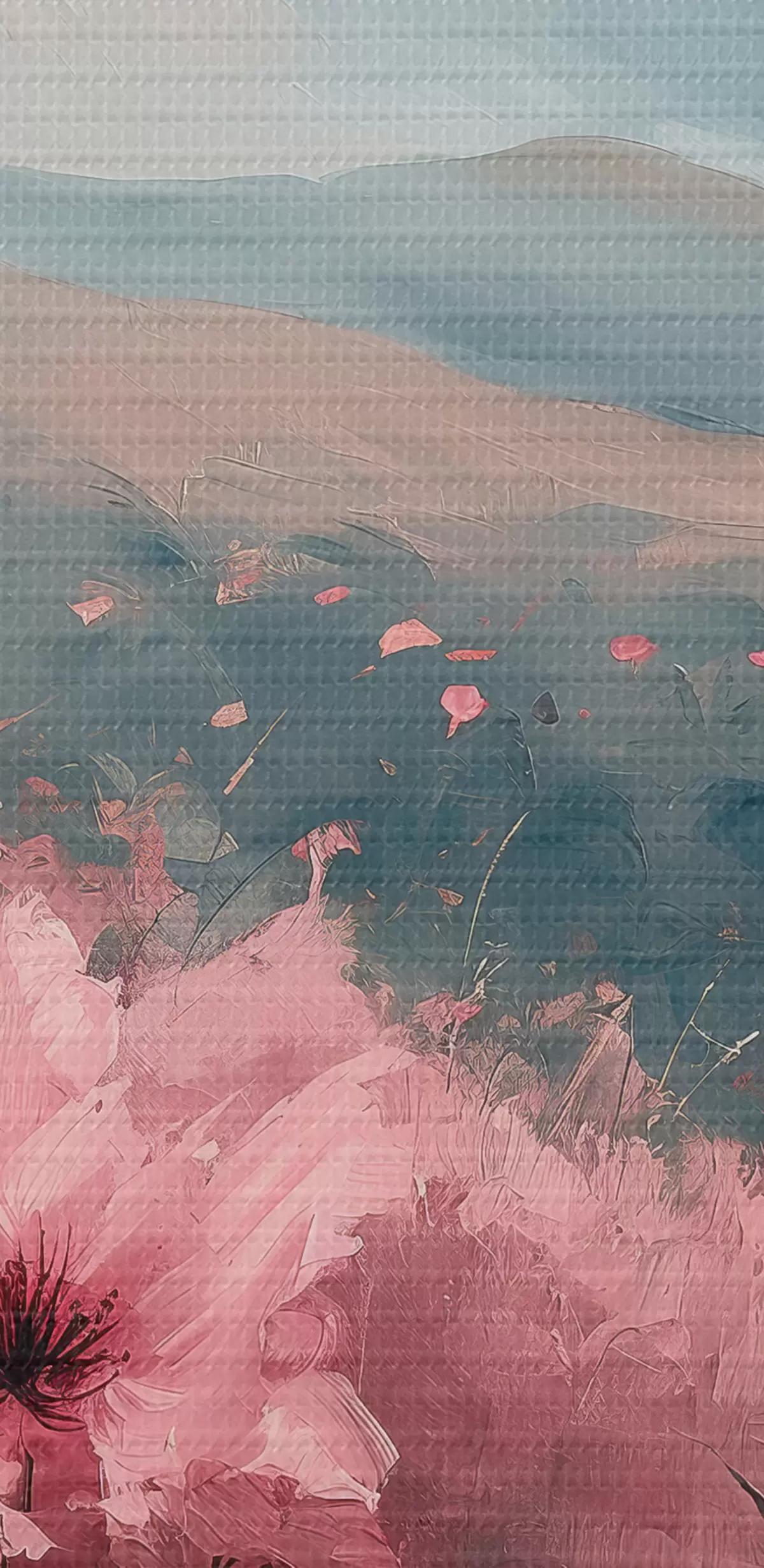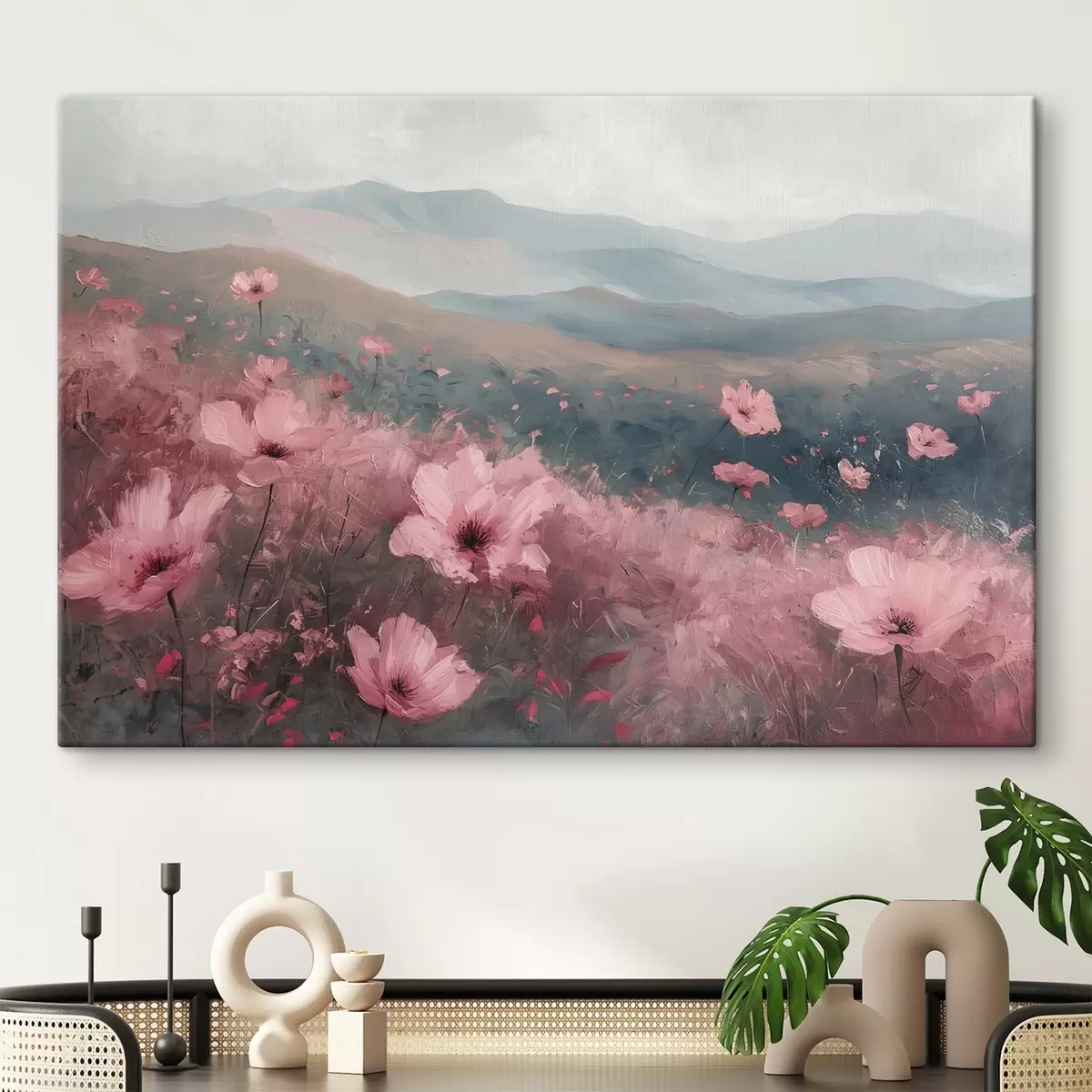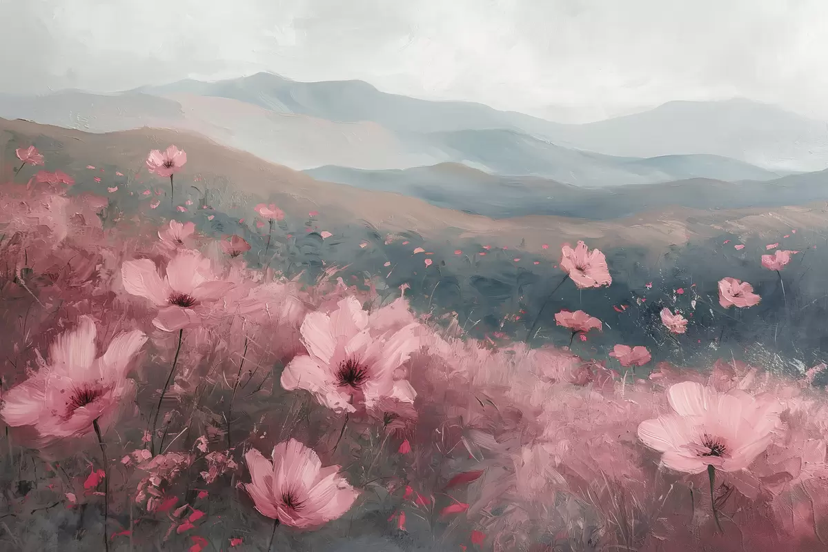 Peinture Fleurs roses dans le pré, paysage naturel, montagnes, peinture à l'huile, coups de pinceau vifs Art. s40233