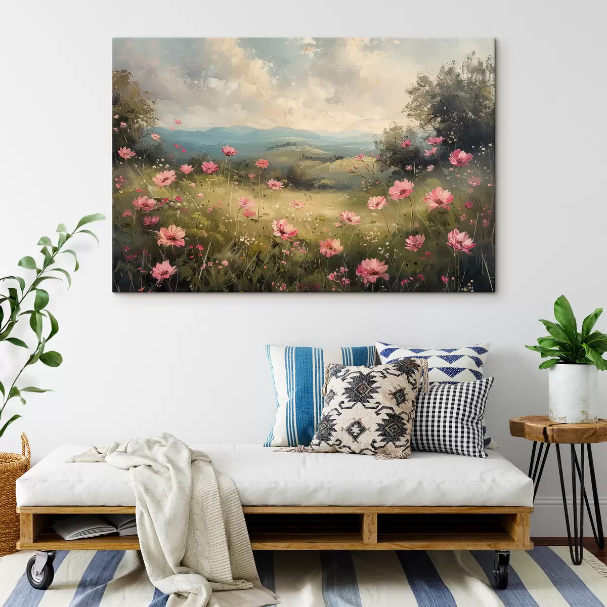 Peintures Prairie avec des fleurs roses, herbe verte, paysage naturel, ciel avec nuages, dessin acrylique s40234