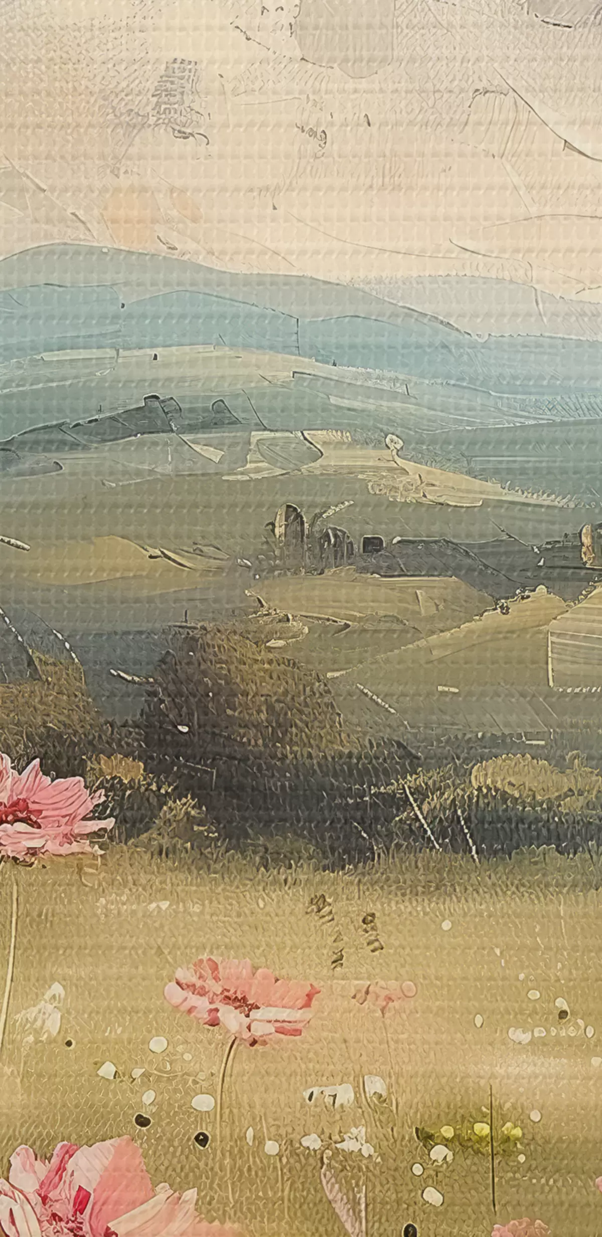 Peinture Prairie avec des fleurs roses, herbe verte, paysage naturel, ciel avec nuages, dessin acrylique Art. s40234
