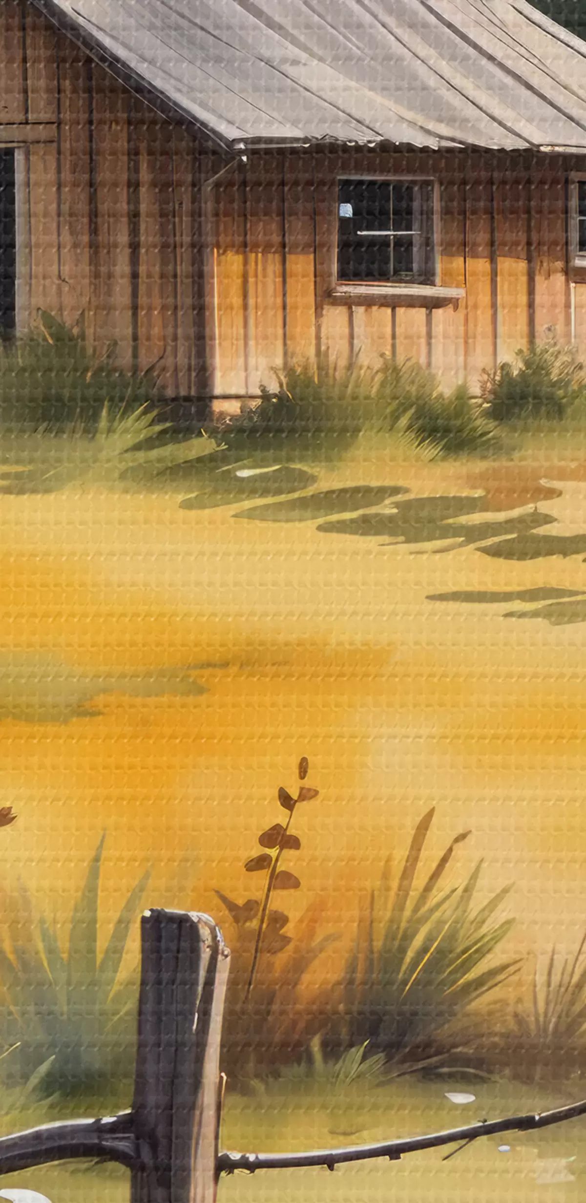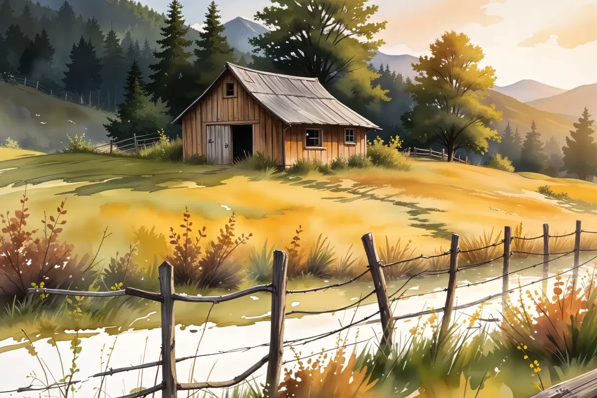 Peinture Une vieille maison en bois dans un cadre rural, entourée d'un champ herbeux, de pins et de montagnes Art. s40394