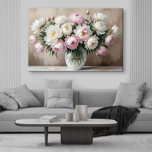 Peintures Un bouquet de belles pivoines roses et blanches dans un vase en verre, disposé sur une surface en bois s40398