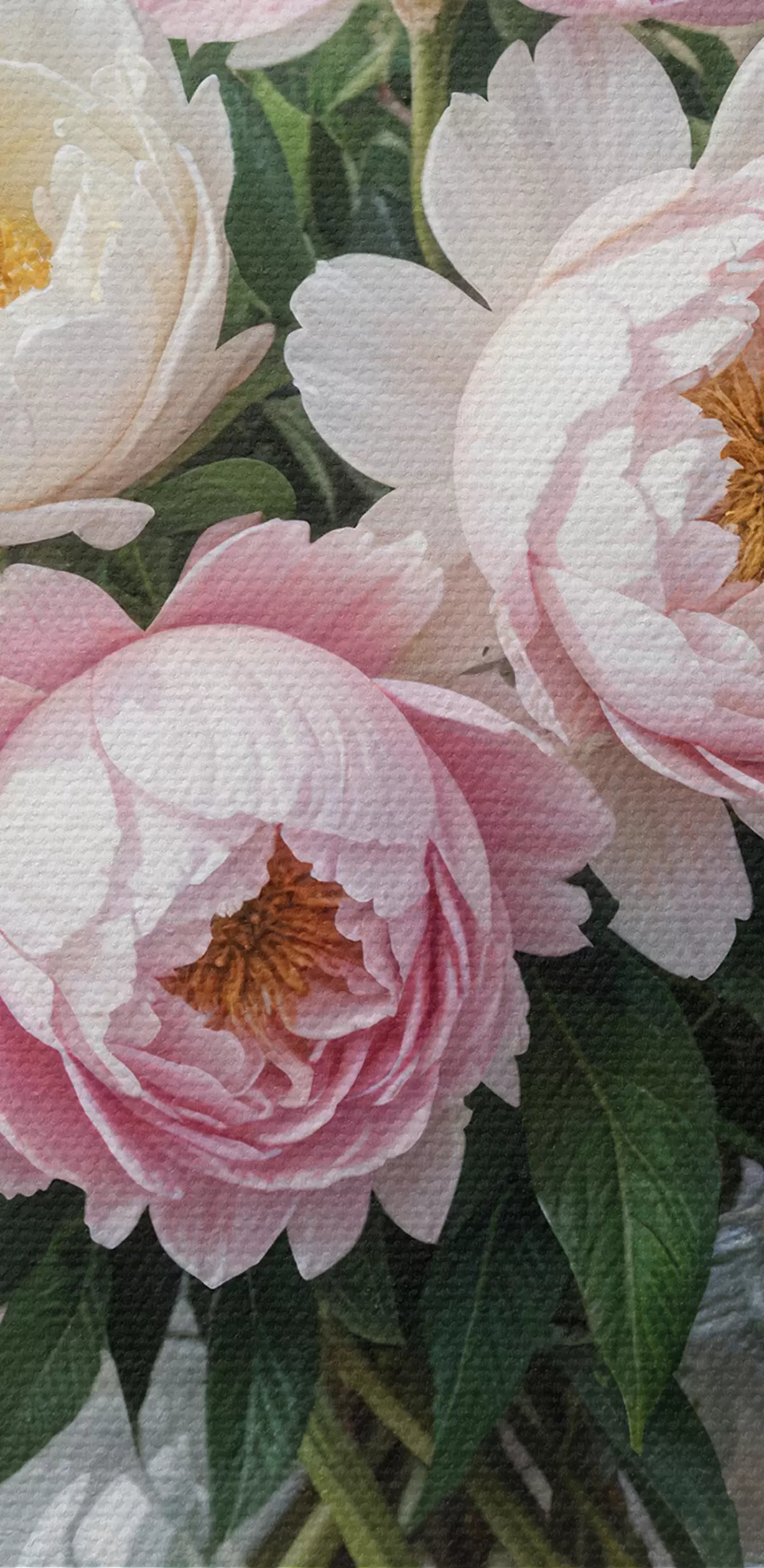 Peinture Un bouquet de belles pivoines roses et blanches dans un vase en verre, disposé sur une surface en bois Art. s40398