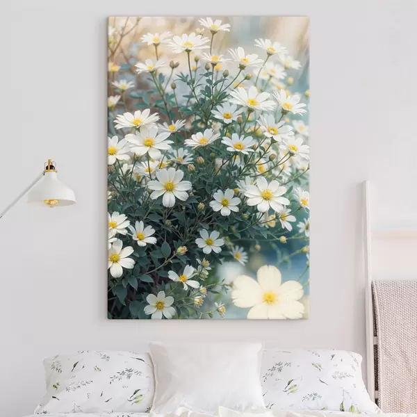 Peintures Un champ de fleurs de marguerites blanches avec un feuillage vert, sur un fond flou s40413