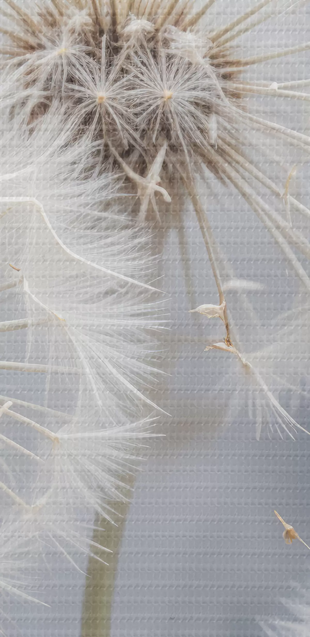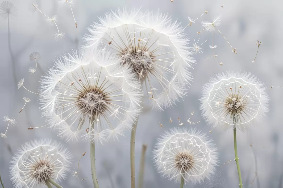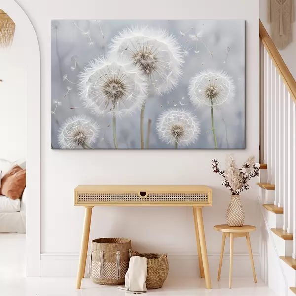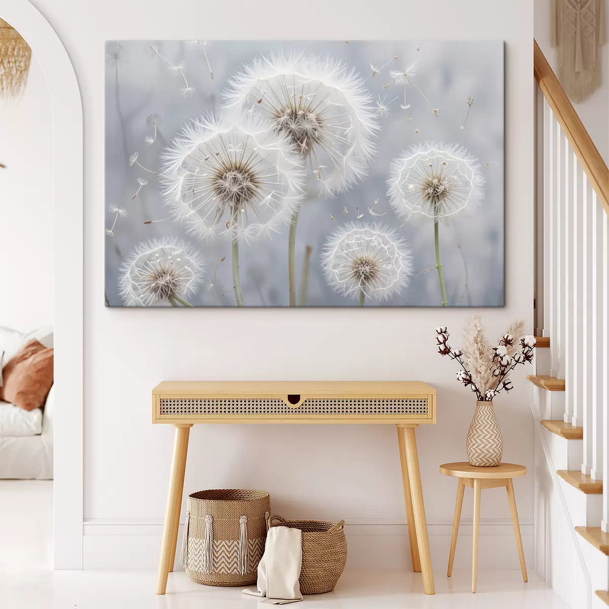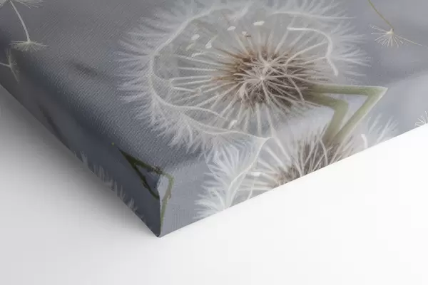Peinture Fleurs de pissenlit blanches avec des graines duveteuses sur un fond gris flou Art. s40556
