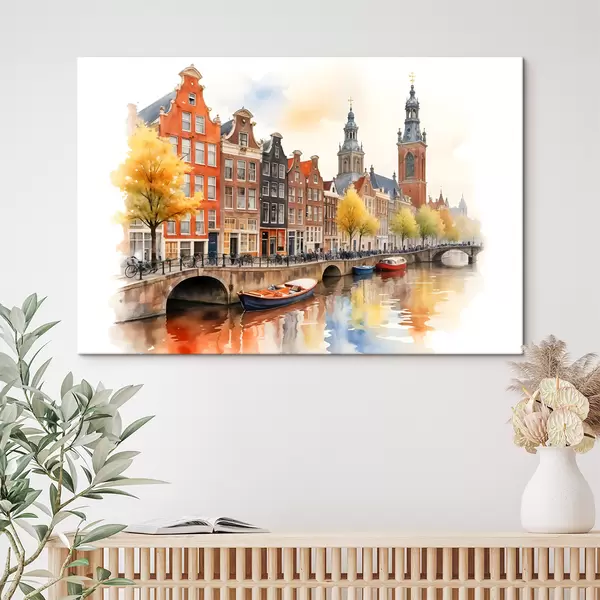 Peintures Un paysage urbain coloré à l'aquarelle d'Amsterdam avec des maisons de canal hollandaises traditionnelles et des bateaux sur l'eau s40561