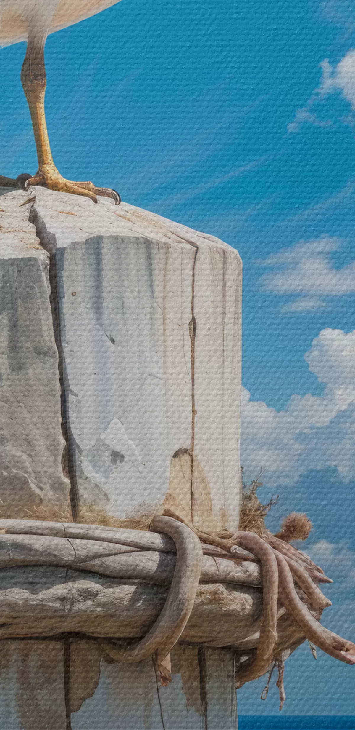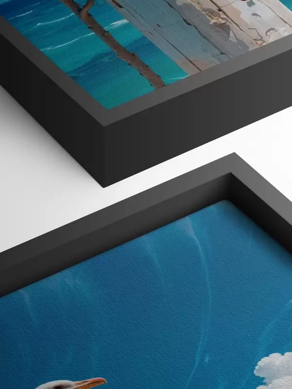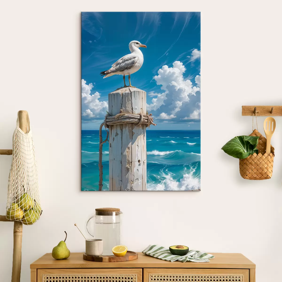 Peinture Une mouette blanche perchée sur un poteau en bois sur fond de ciel bleu vif et d'océan avec des vagues Art. s40590