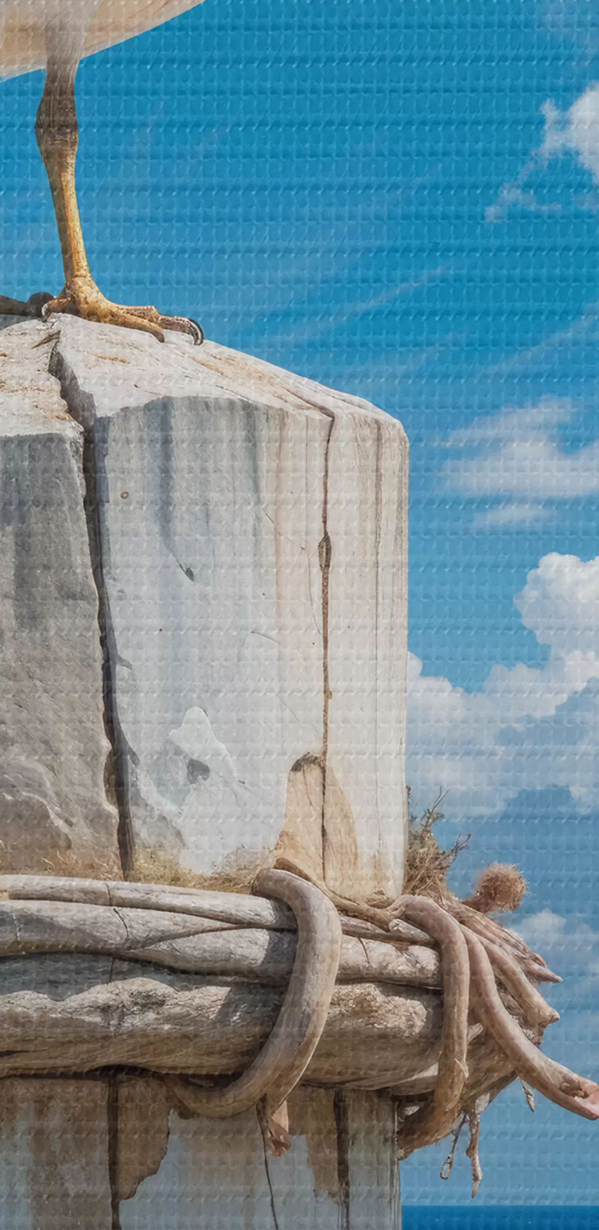 Peintures Une mouette blanche perchée sur un poteau en bois sur fond de ciel bleu vif et d'océan avec des vagues s40590