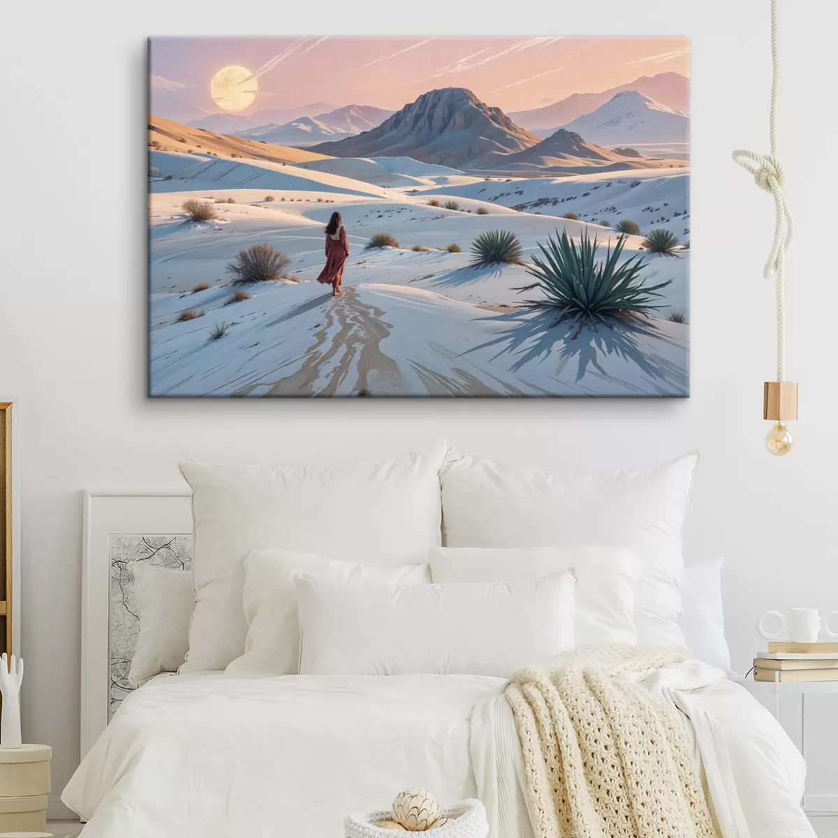 Peinture Une femme en robe rouge dans un paysage désertique avec une montagne en arrière-plan et des dunes de sable Art. s40603