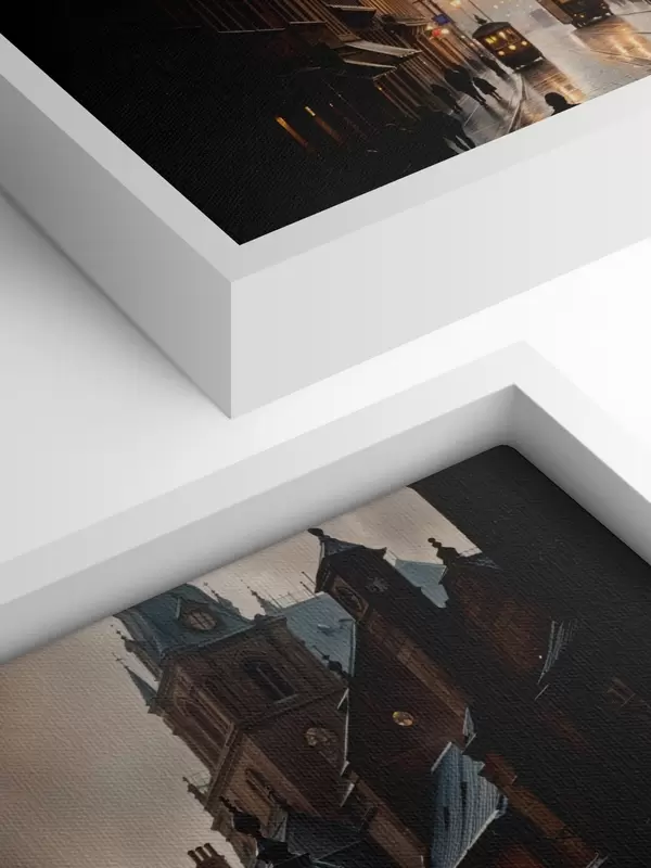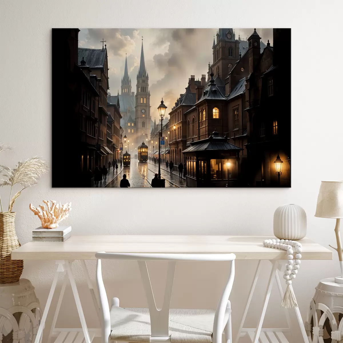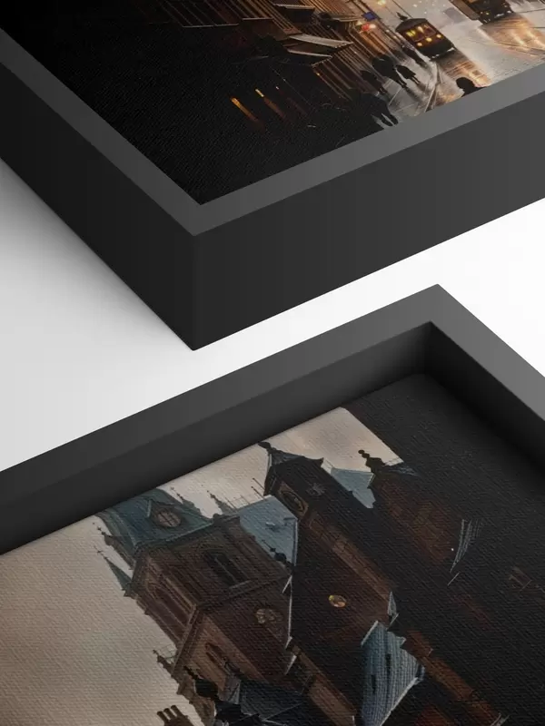 Peinture Une soirée pluvieuse dans une vieille ville européenne, avec des rues pavées, des bâtiments historiques et un tramway qui passe Art. s40604
