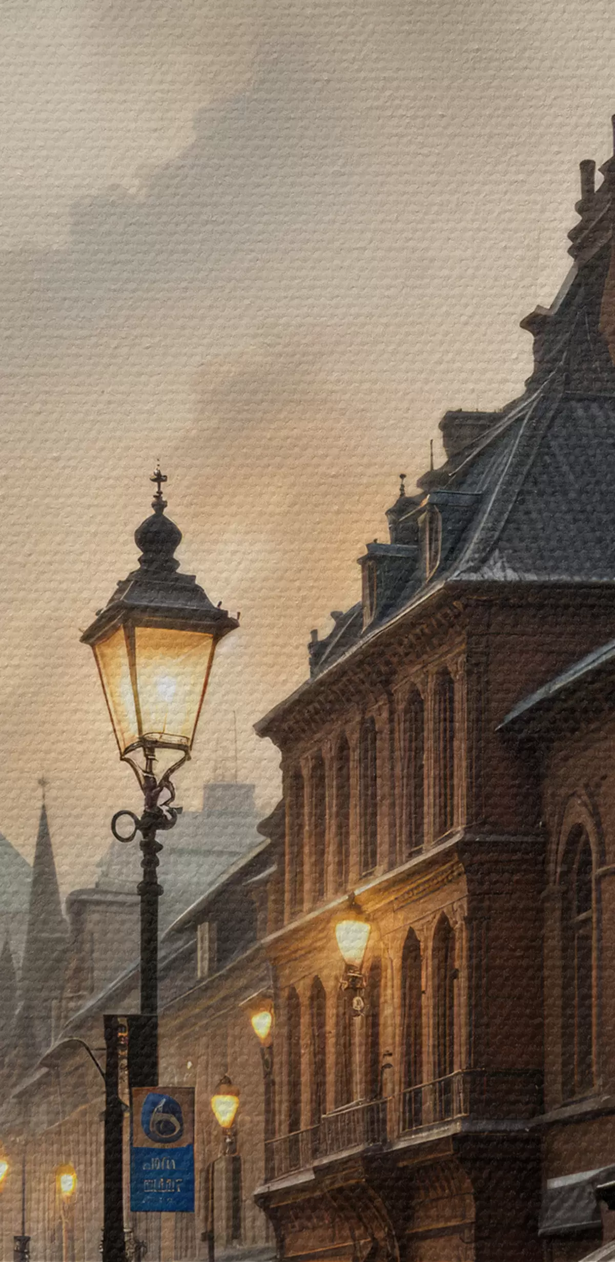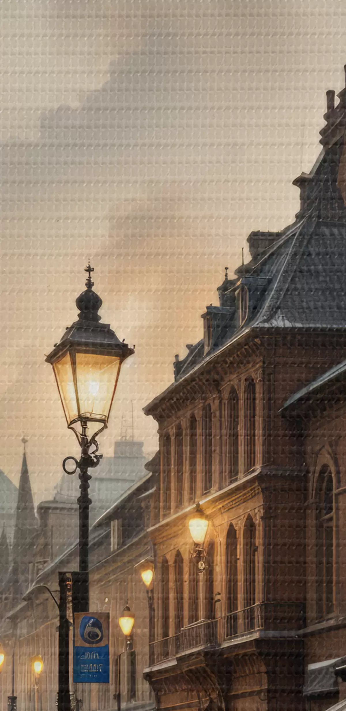 Peintures Une soirée pluvieuse dans une vieille ville européenne, avec des rues pavées, des bâtiments historiques et un tramway qui passe s40604