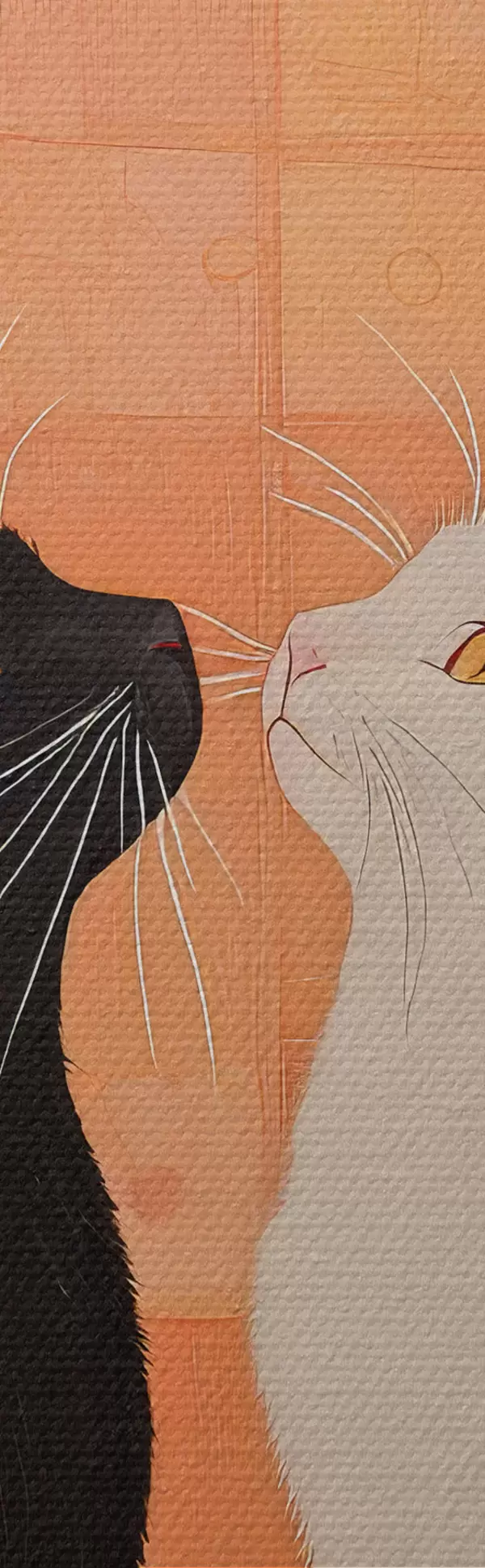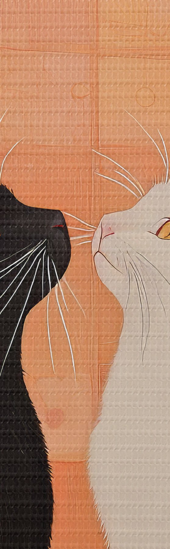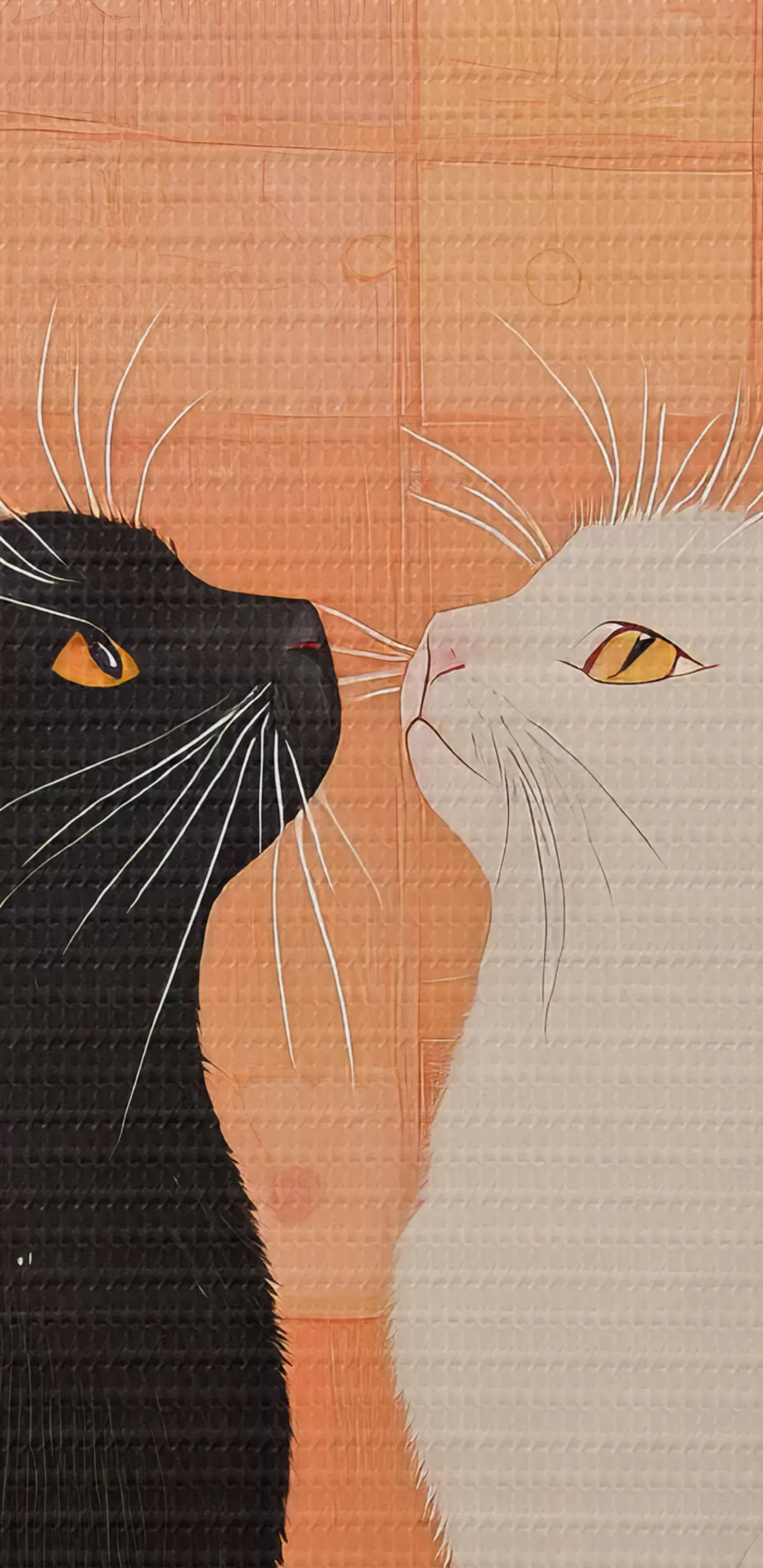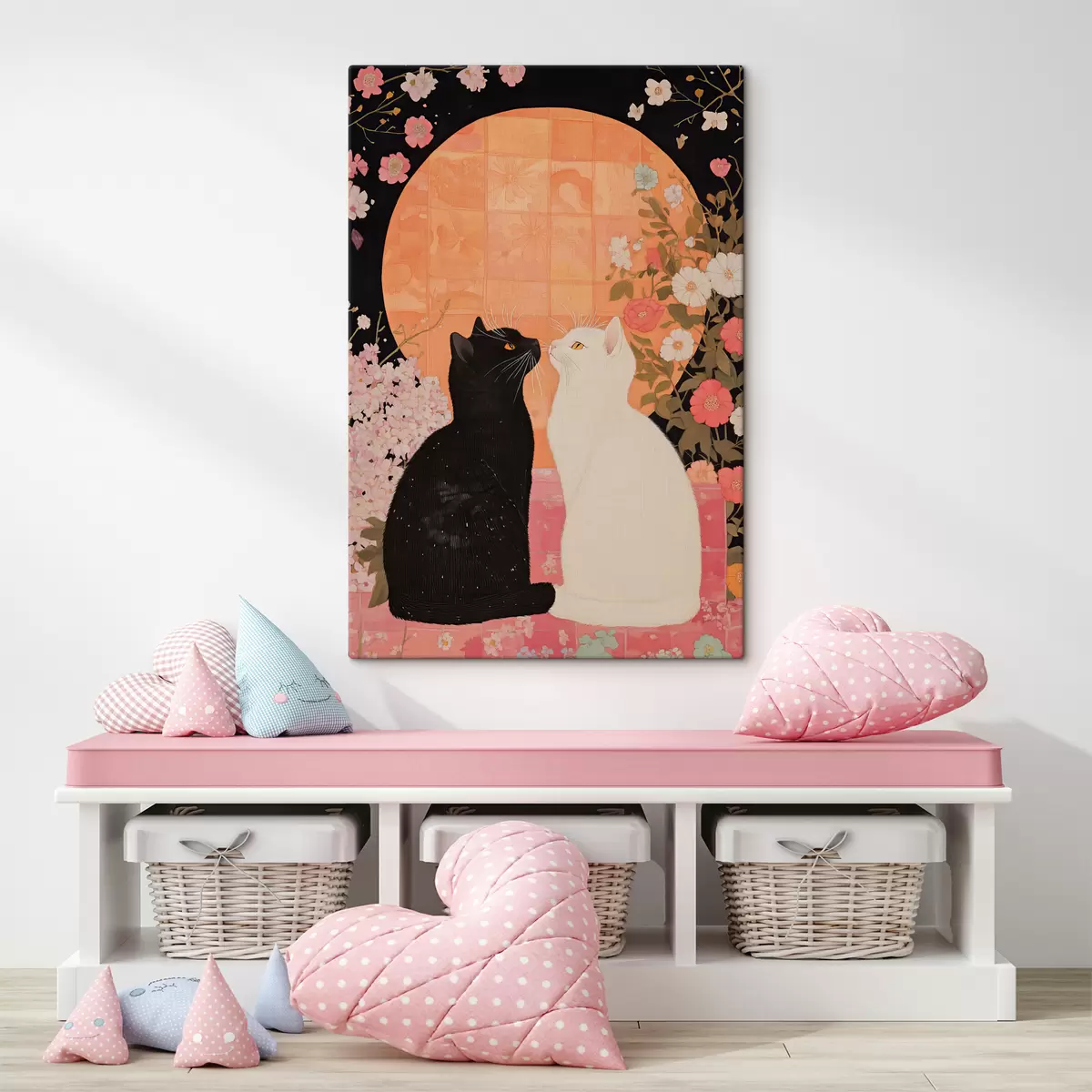 Peinture Chat noir et chat blanc se regardant mutuellement au coucher du soleil Art. s40669