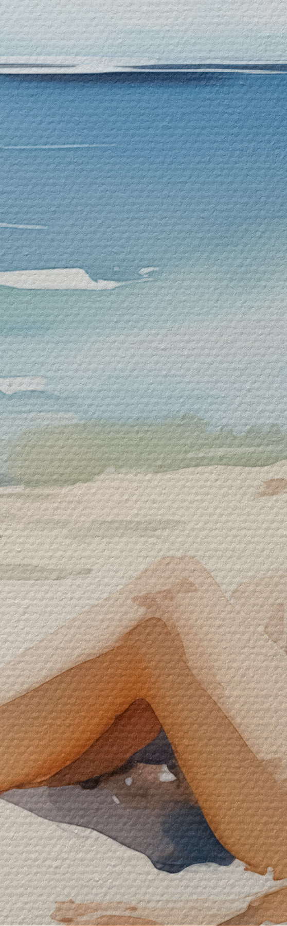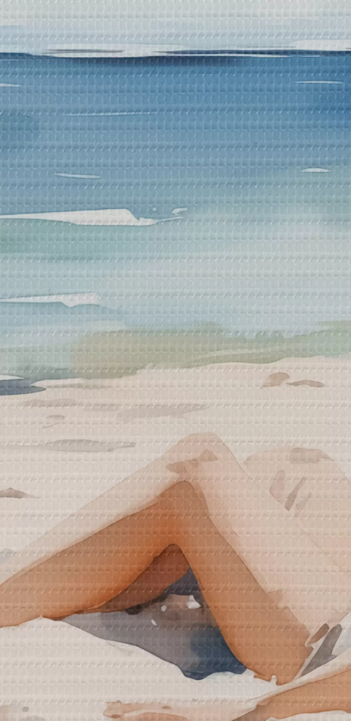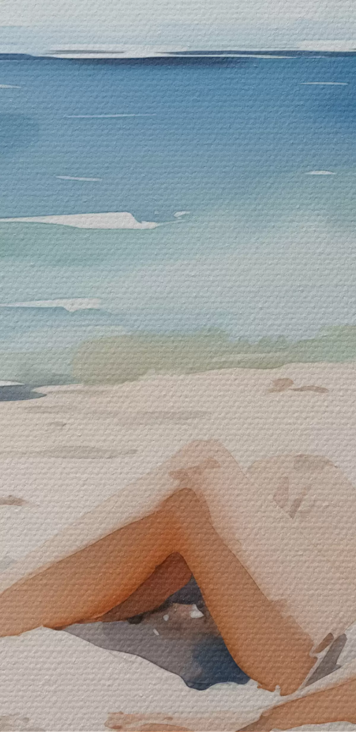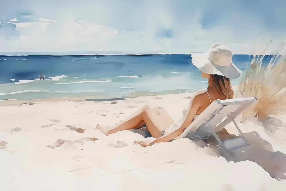 Peinture Fille se relaxant sur la plage au bord de la mer aquarelle Art. s40679