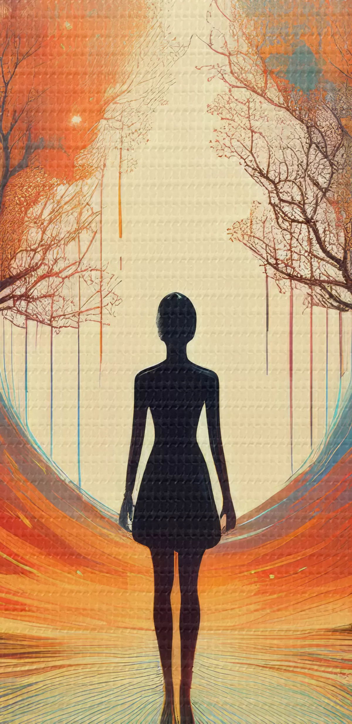 Peinture silhouette entre les arbres, connaissance de soi, réflexion sur soi Art. s40713