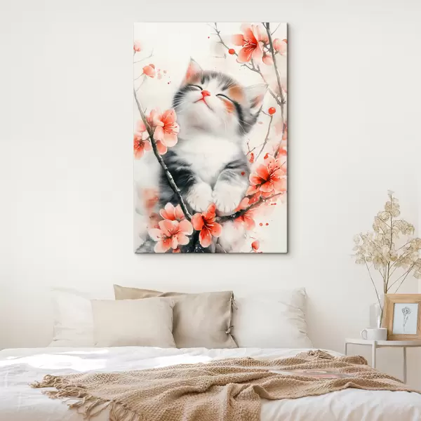Peinture Chaton mignon sur une branche avec des fleurs Art. s40734