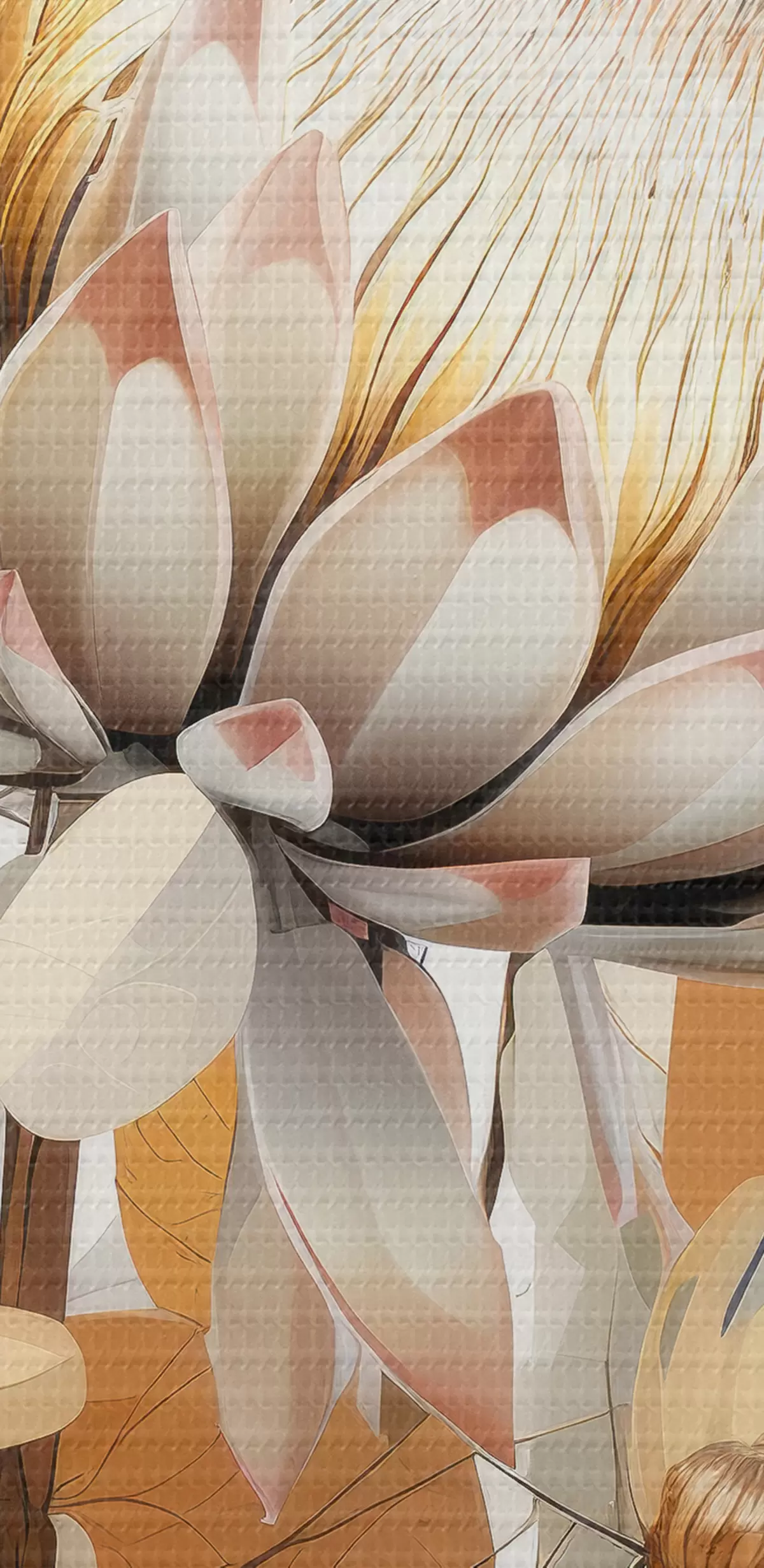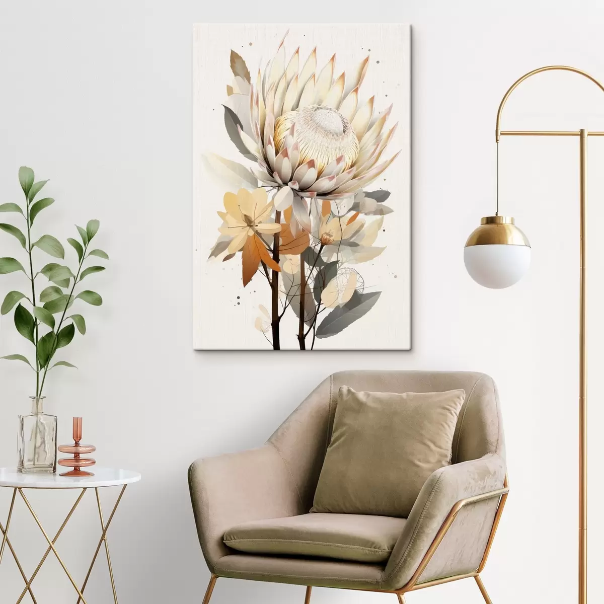Peinture Magnifiques fleurs de protéa avec des feuilles luxuriantes, couleurs douces et beiges, coton Art. s40817