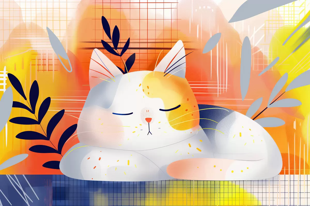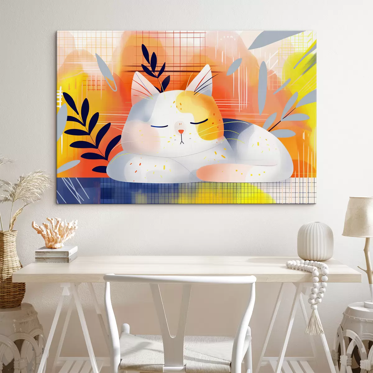Peintures Un chat mignon dormant parmi des plantes dans un style graphique s40956