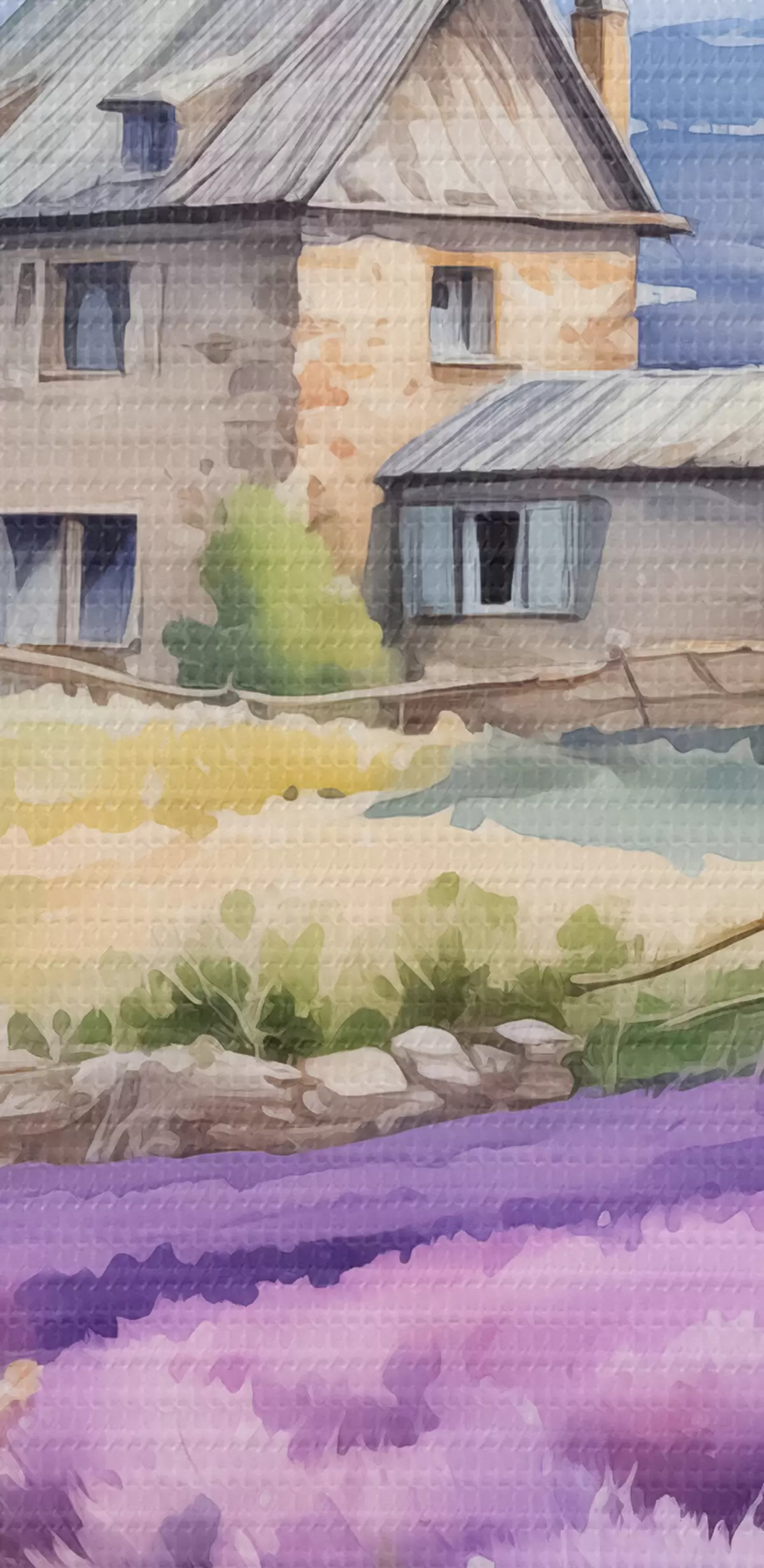 Peinture Maison de campagne avec les montagnes en arrière-plan près d'un champ de lavande Art. s41012