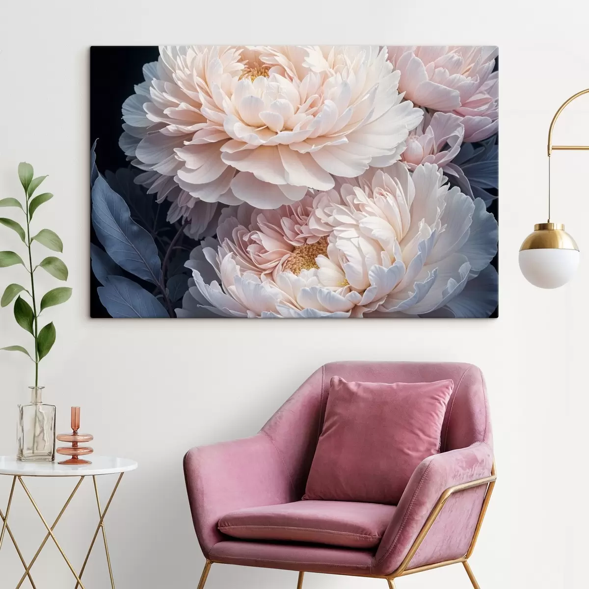 Peintures Délicates pivoines rose pastel aux pétales doux et duveteux et feuilles bleues sur fond sombre s41092