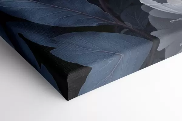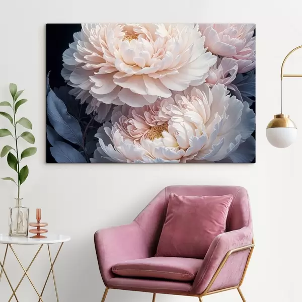 Peinture Délicates pivoines rose pastel aux pétales doux et duveteux et feuilles bleues sur fond sombre Art. s41092