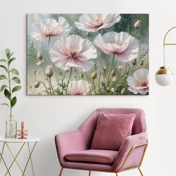 Peinture Un champ de délicates fleurs de pavot rose pâle aux pétales doux et ondulants sur un fond vert flou Art. s41094
