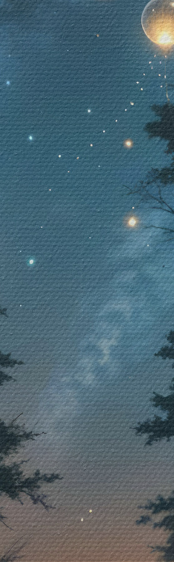 Peinture Une forêt magique la nuit, avec des orbes jaunes et des lucioles flottant entre les arbres, créant une atmosphère fantaisiste Art. s41259