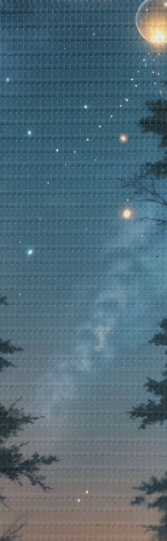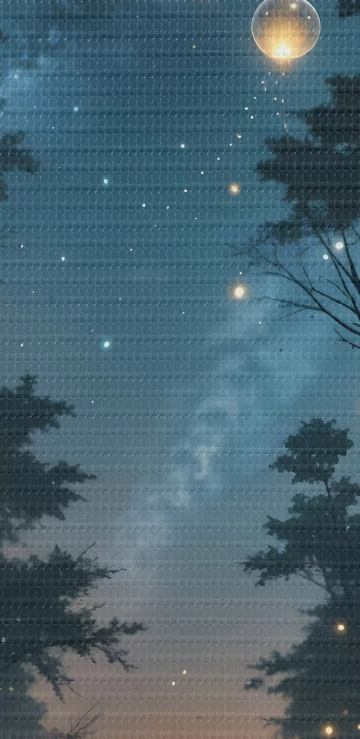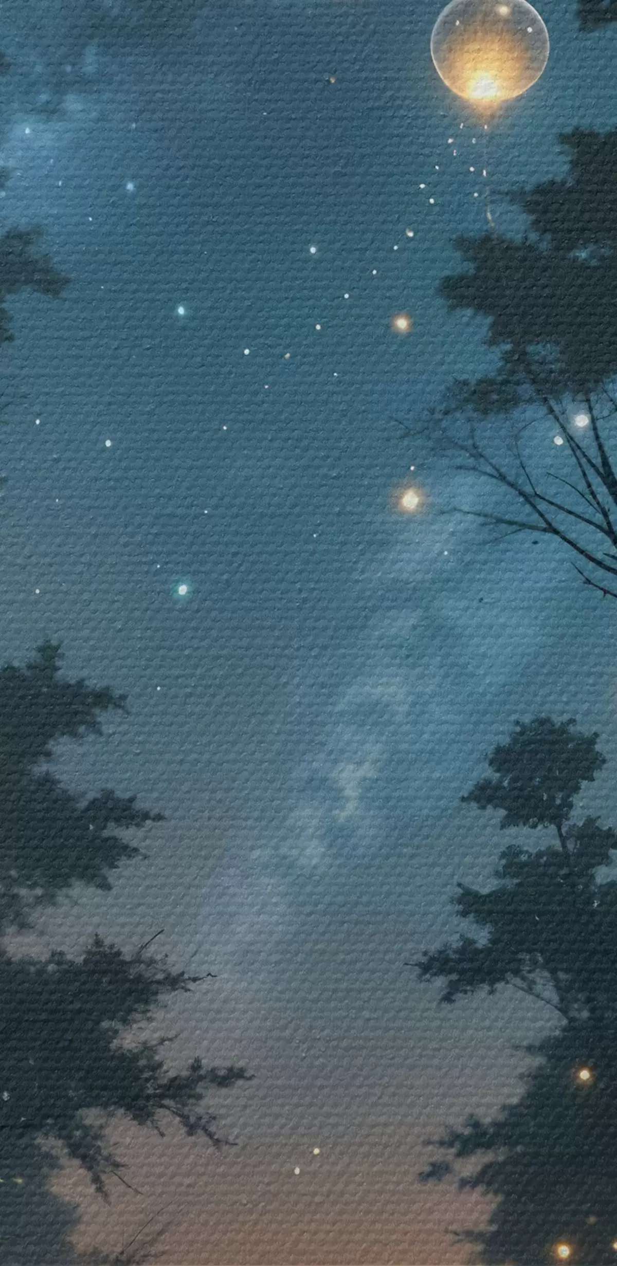 Peintures Une forêt magique la nuit, avec des orbes jaunes et des lucioles flottant entre les arbres, créant une atmosphère fantaisiste s41259