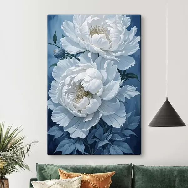 Peinture Pivoines blanches avec feuilles vertes sur fond bleu foncé Art. s41270