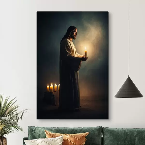 Peintures Jésus-Christ avec une bougie dans l'obscurité s41315