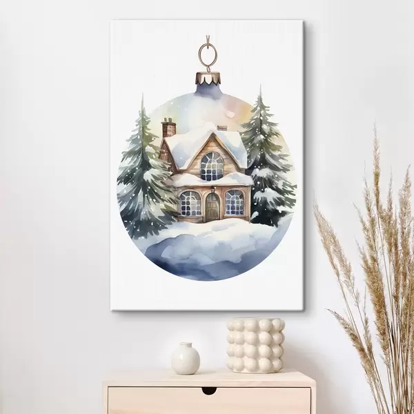 Peintures Boule décorative de Noël avec maison aquarelle dans la neige, sapins s41363