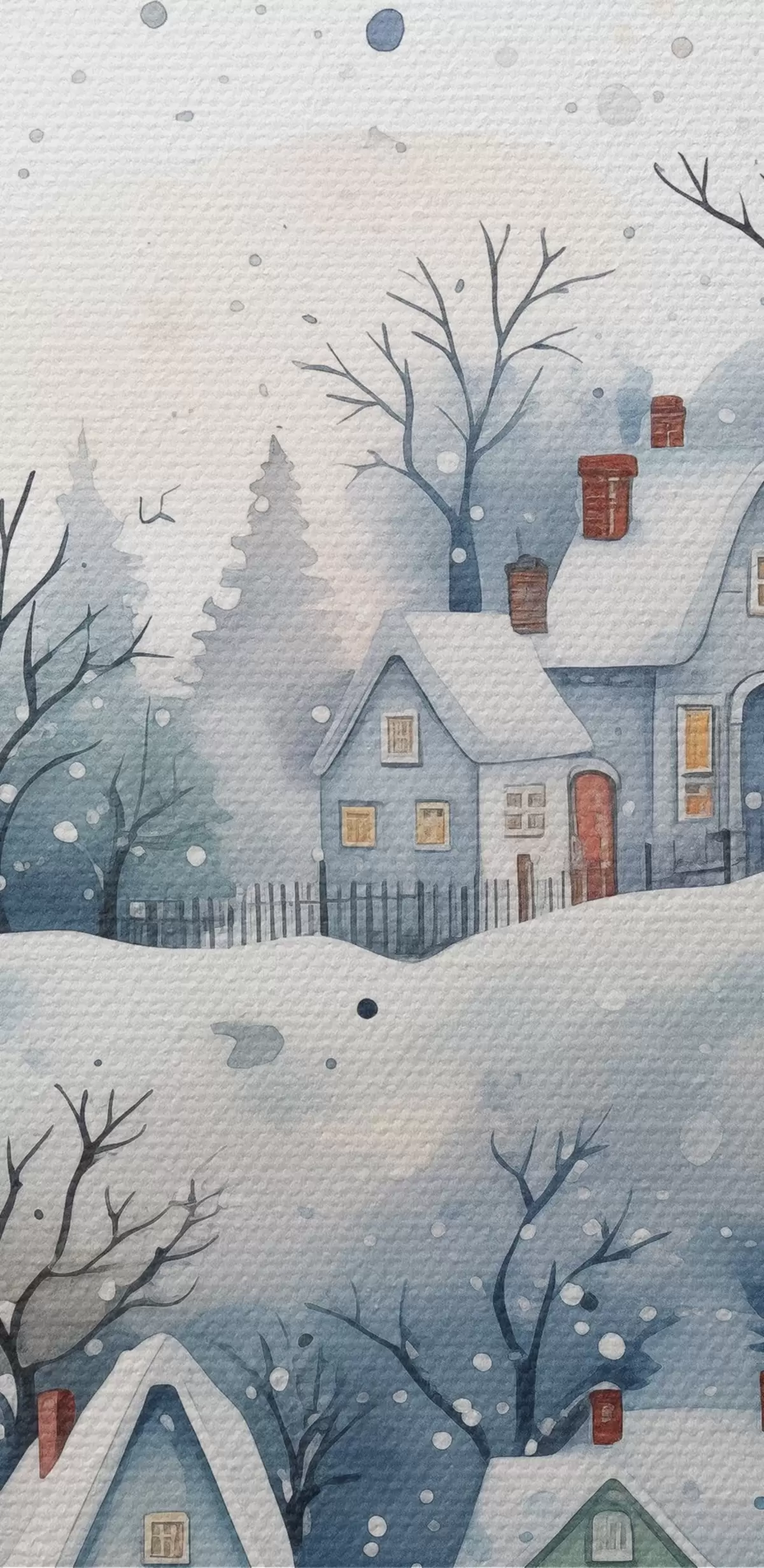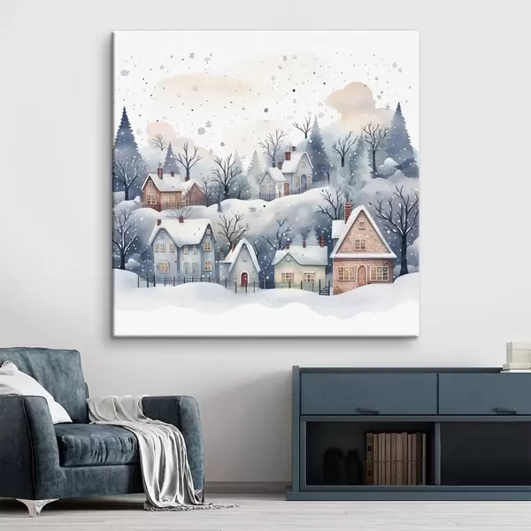 Peinture Aquarelle d'un paysage hivernal avec des maisons et une forêt de pins Art. s41389