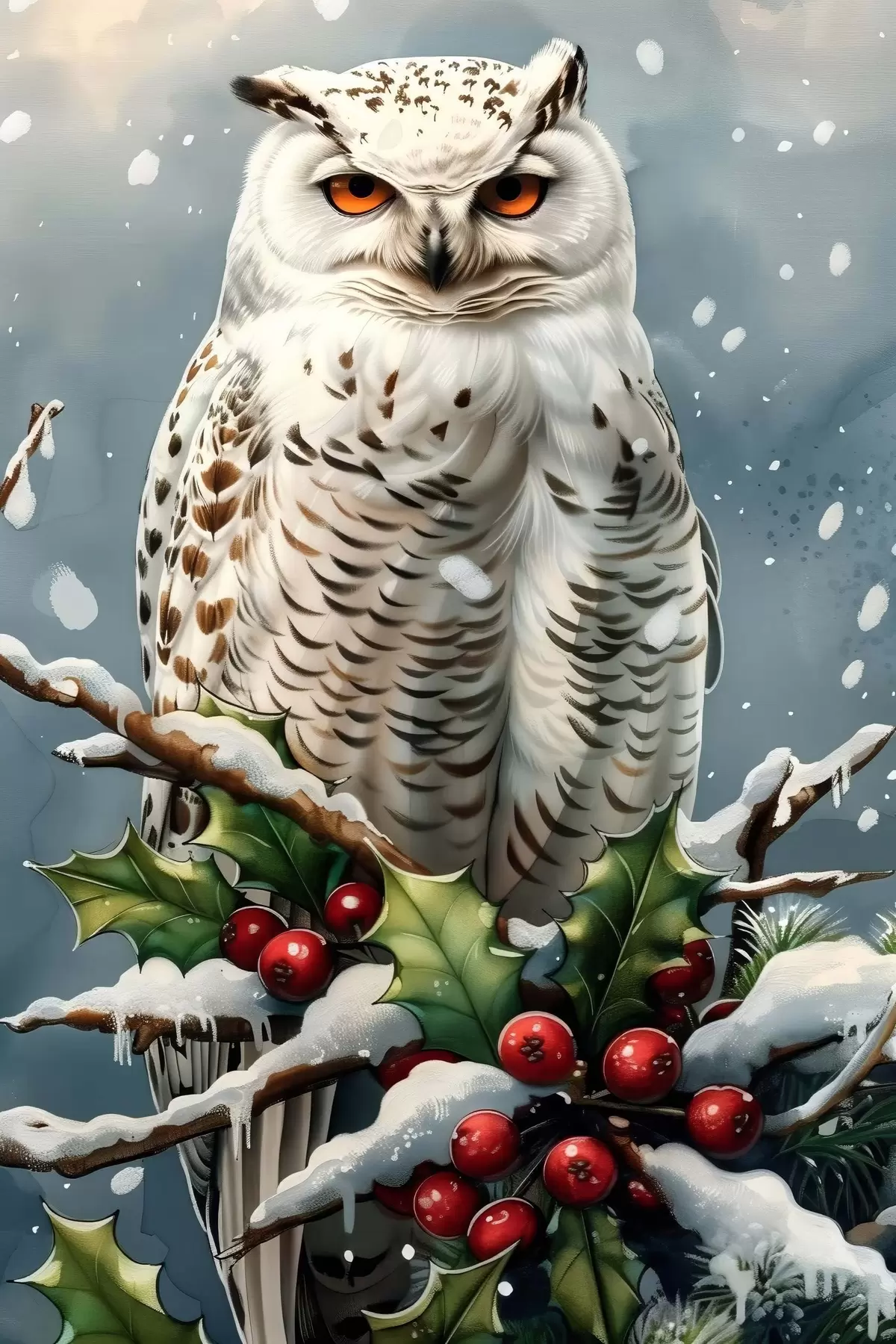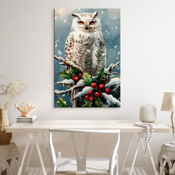 Peinture Hibou sur une branche d'hiver avec des baies et des feuilles Art. s41482