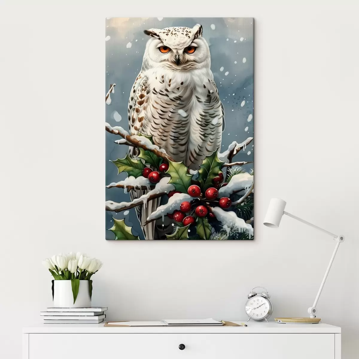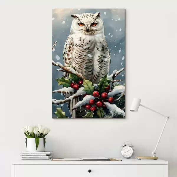 Peintures Hibou sur une branche d'hiver avec des baies et des feuilles s41482