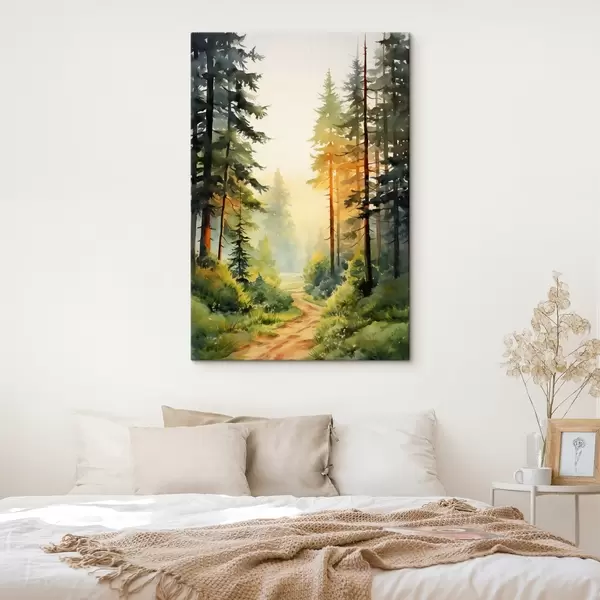 Peinture Belle aquarelle de forêt avec des pins et une douce lumière du soleil Art. s41637