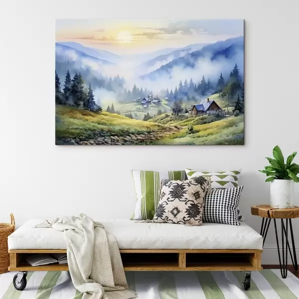 Peintures Village des Carpates dans les montagnes brumeuses, forêt, aquarelle s41648