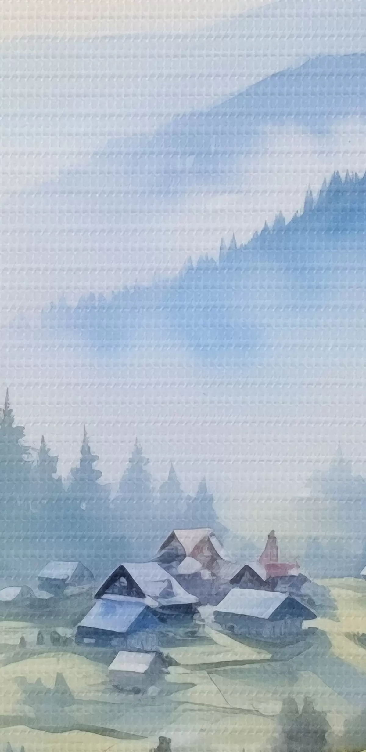 Peinture Village des Carpates dans les montagnes brumeuses, forêt, aquarelle Art. s41648