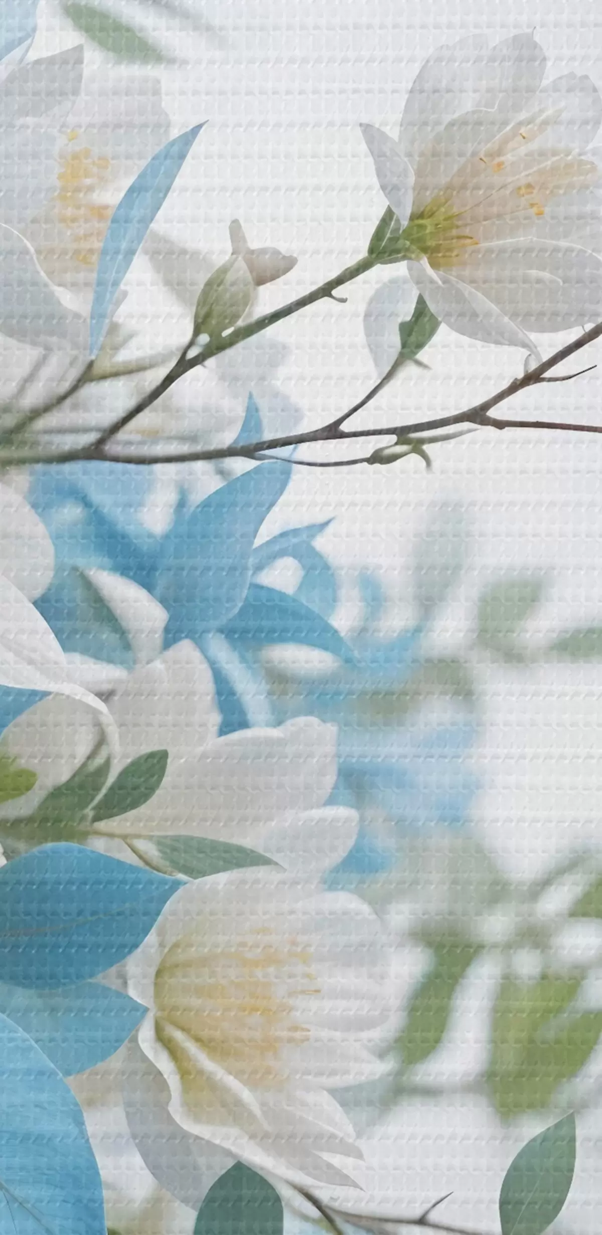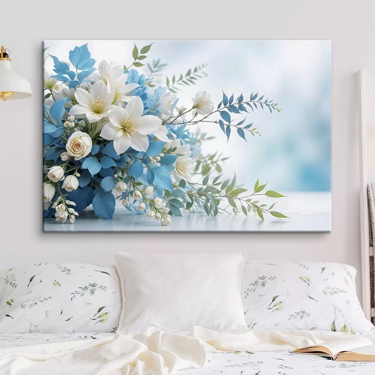 Peinture Bouquet de fleurs blanches et bleues avec des feuilles vertes sur un fond doux et flou Art. s41715