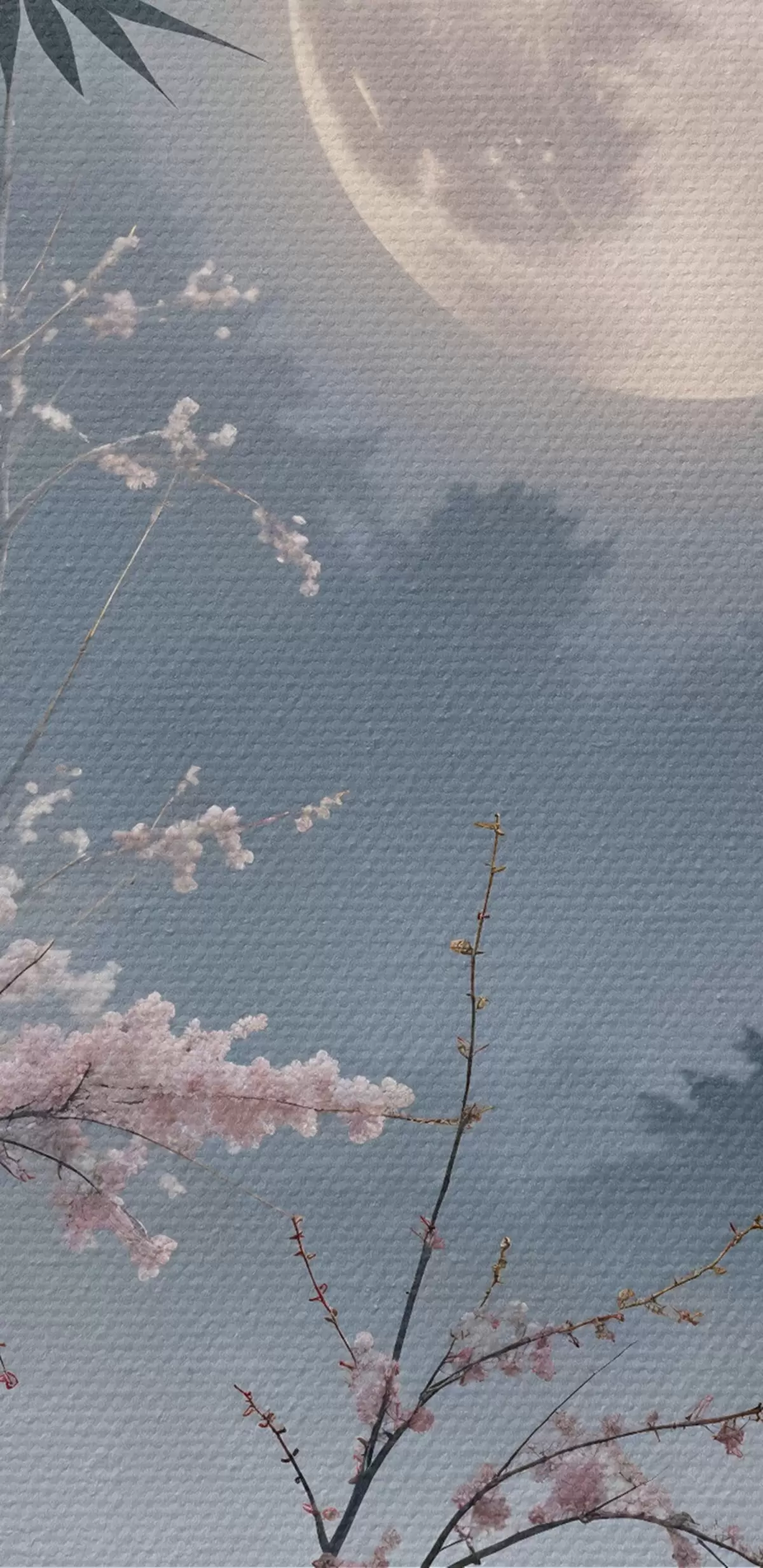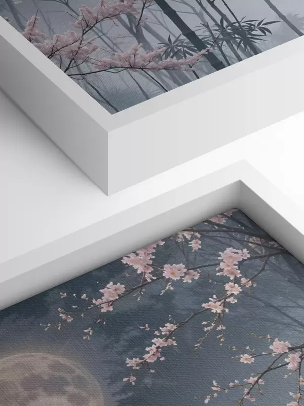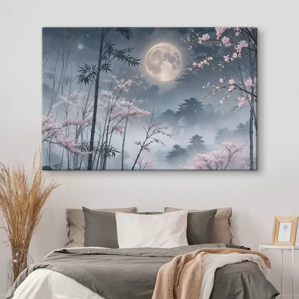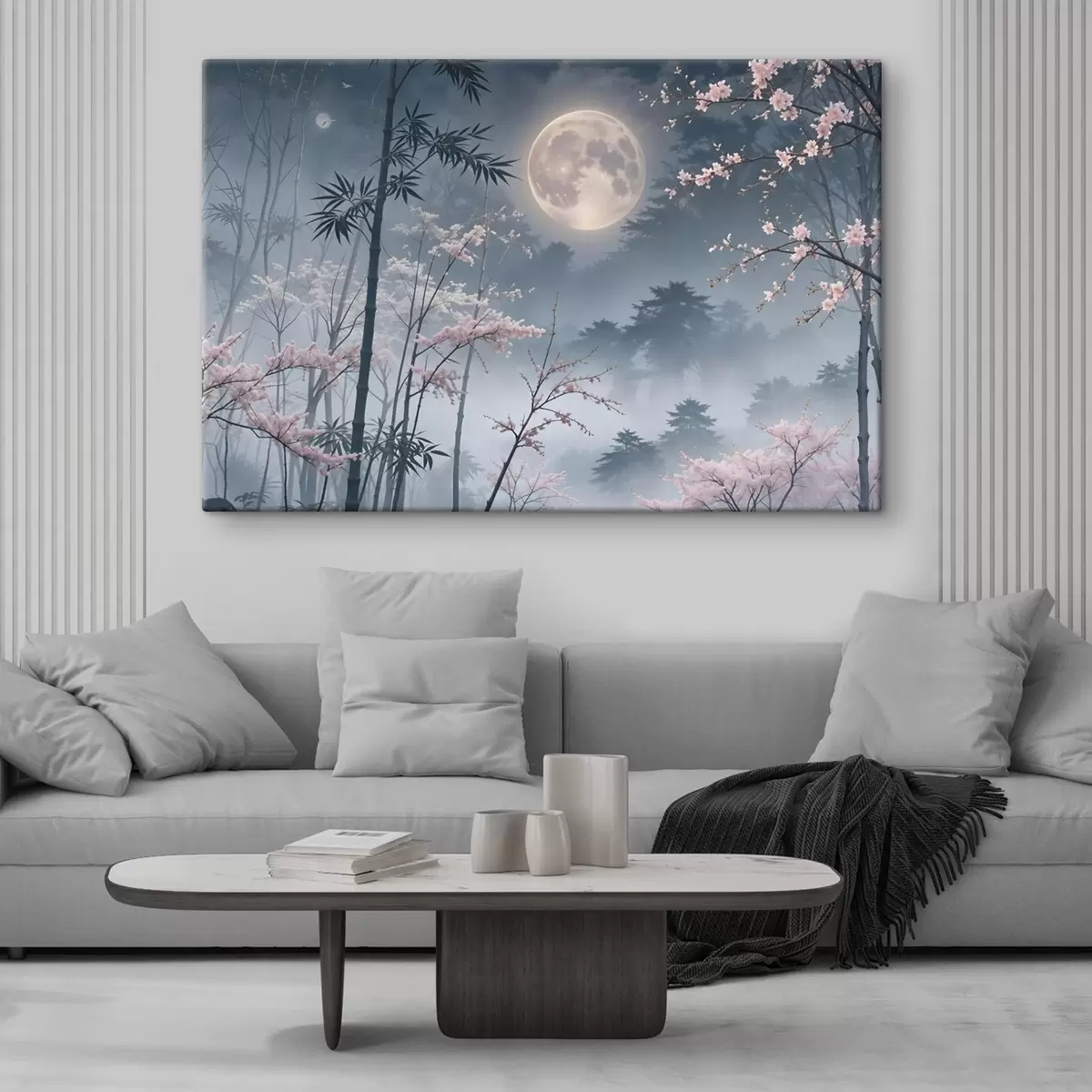 Peinture Une pleine lune dans un ciel nocturne, entourée de silhouettes de bambous et de branches de cerisiers en fleurs Art. s41717