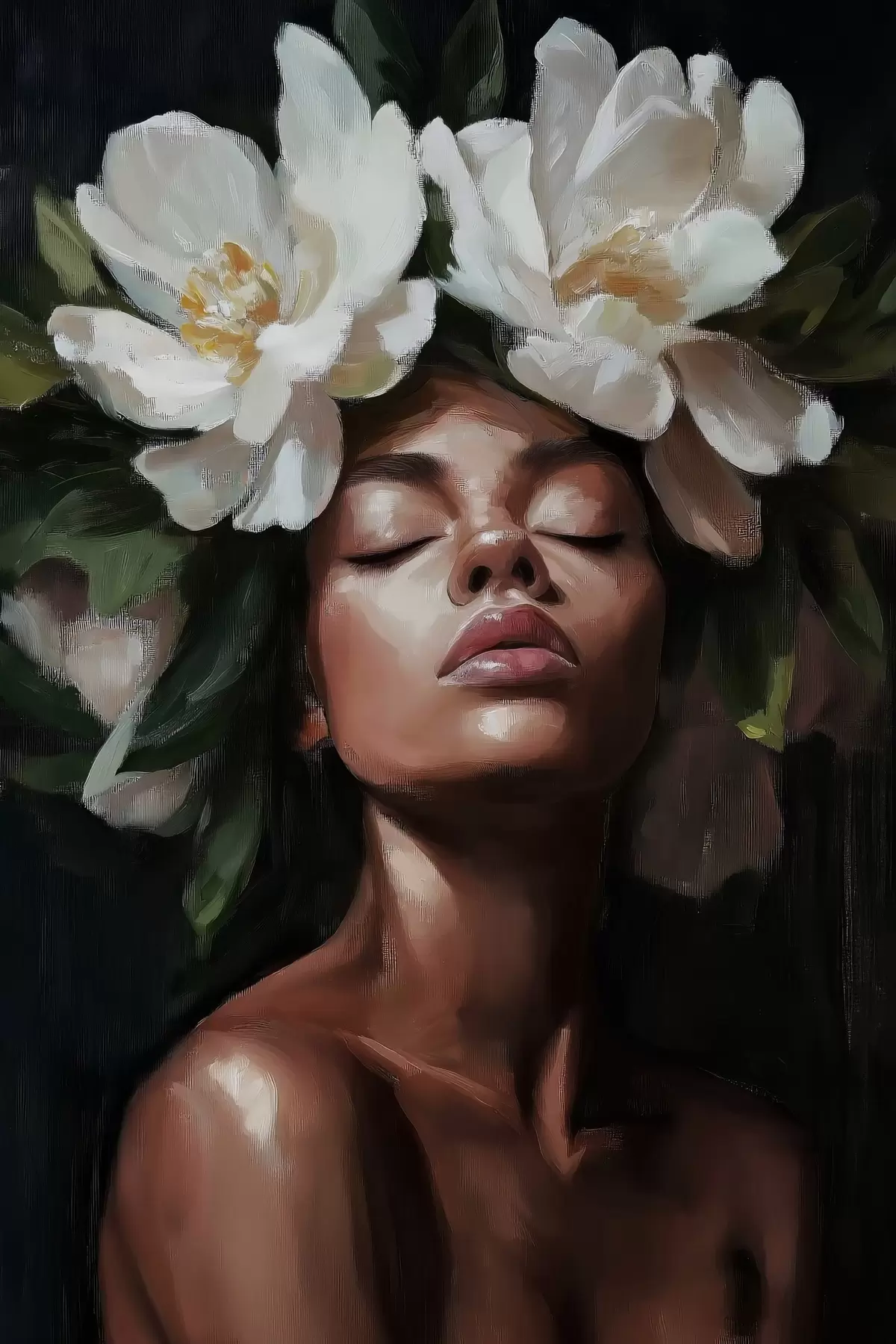 Peinture Portrait de femme avec des fleurs blanches dans les cheveux sur fond sombre Art. s41824