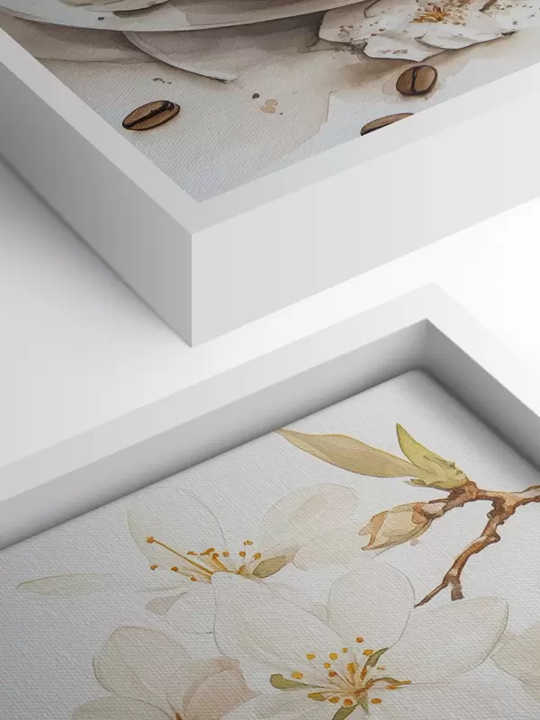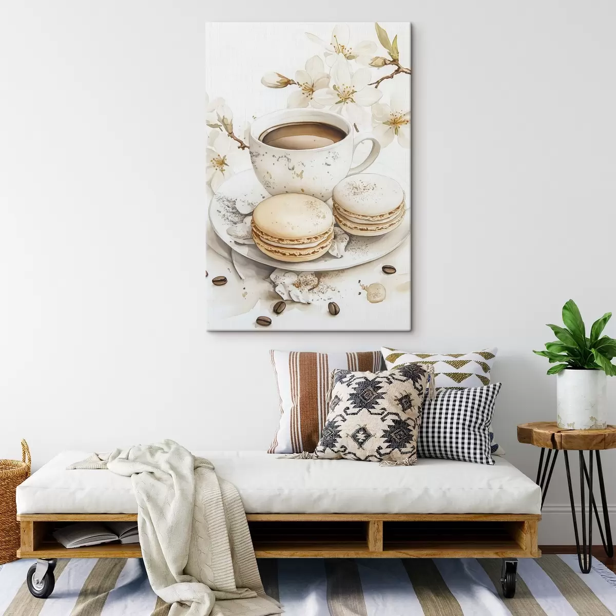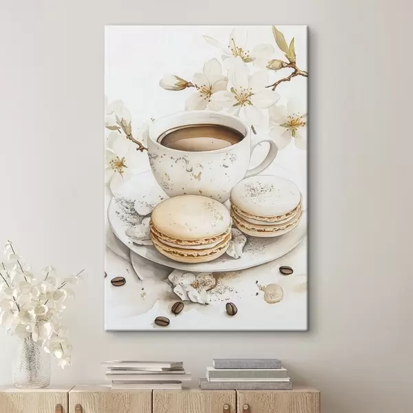 Peinture Coupe de café avec macarons, style aquarelle, couleurs douces, fleurs de jasmin Art. s41949