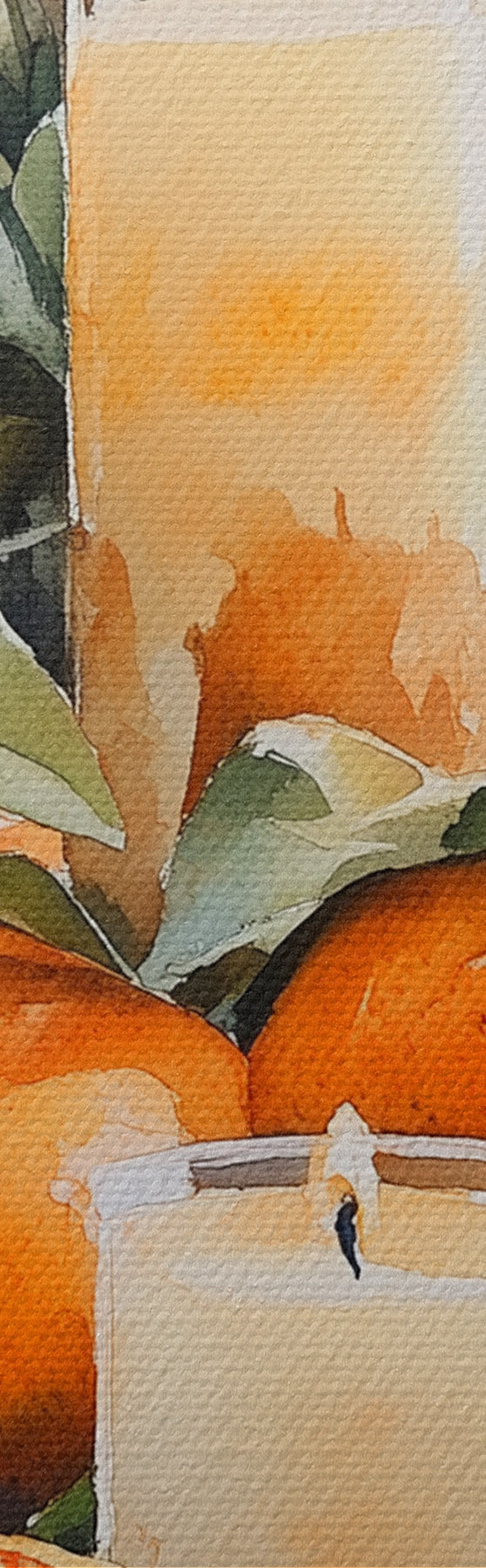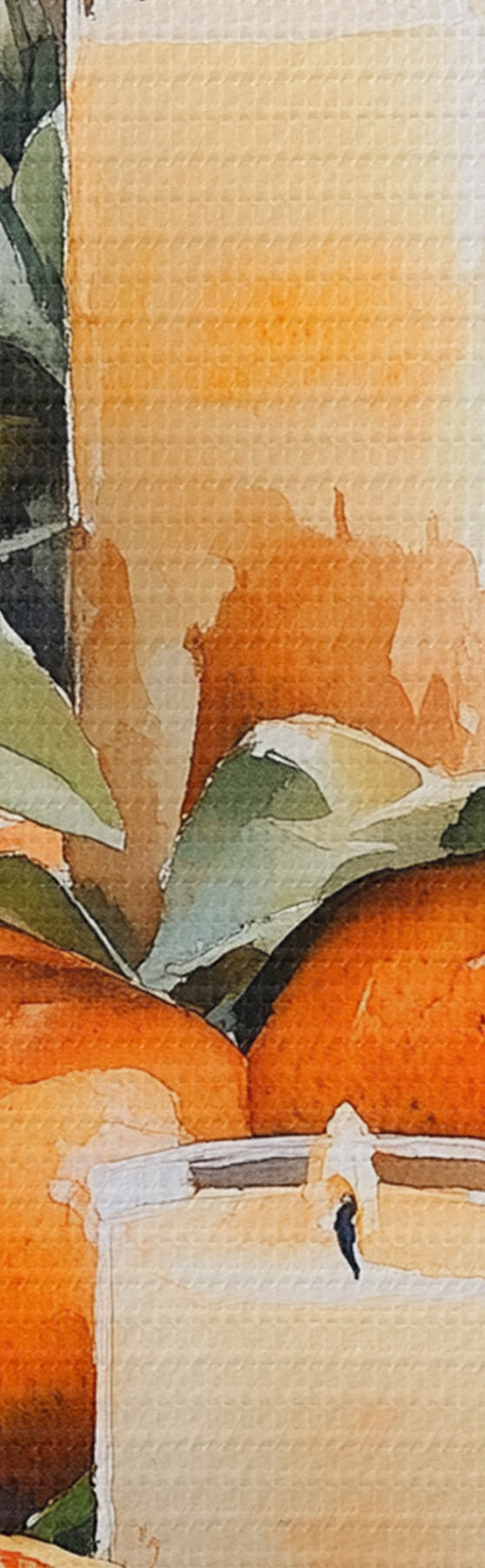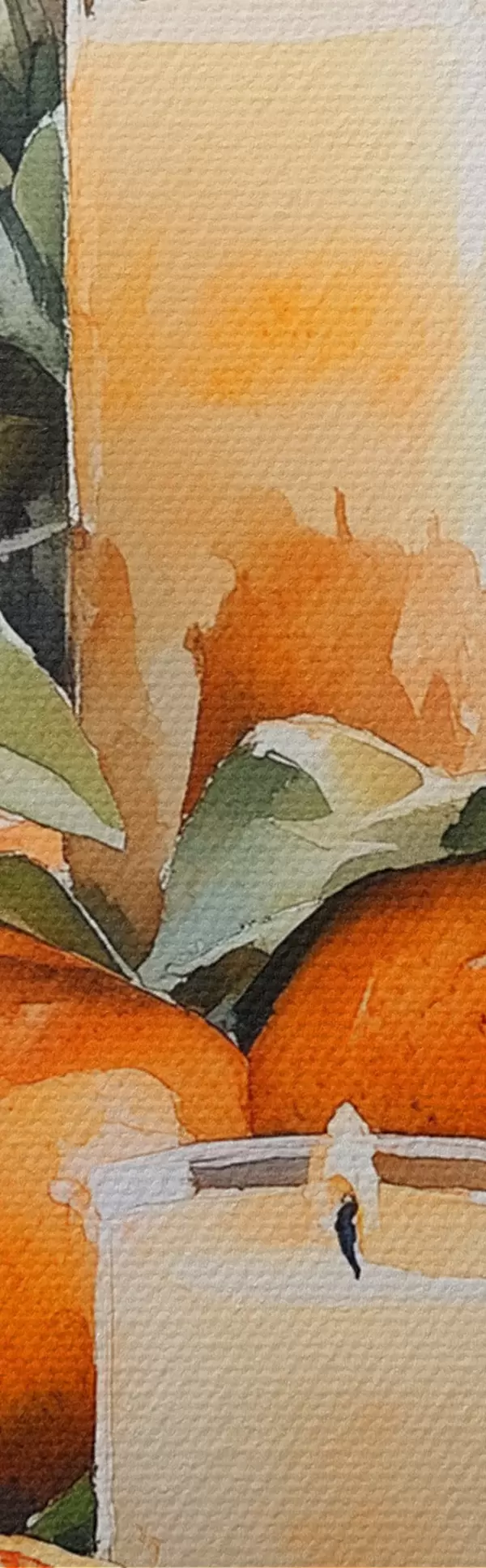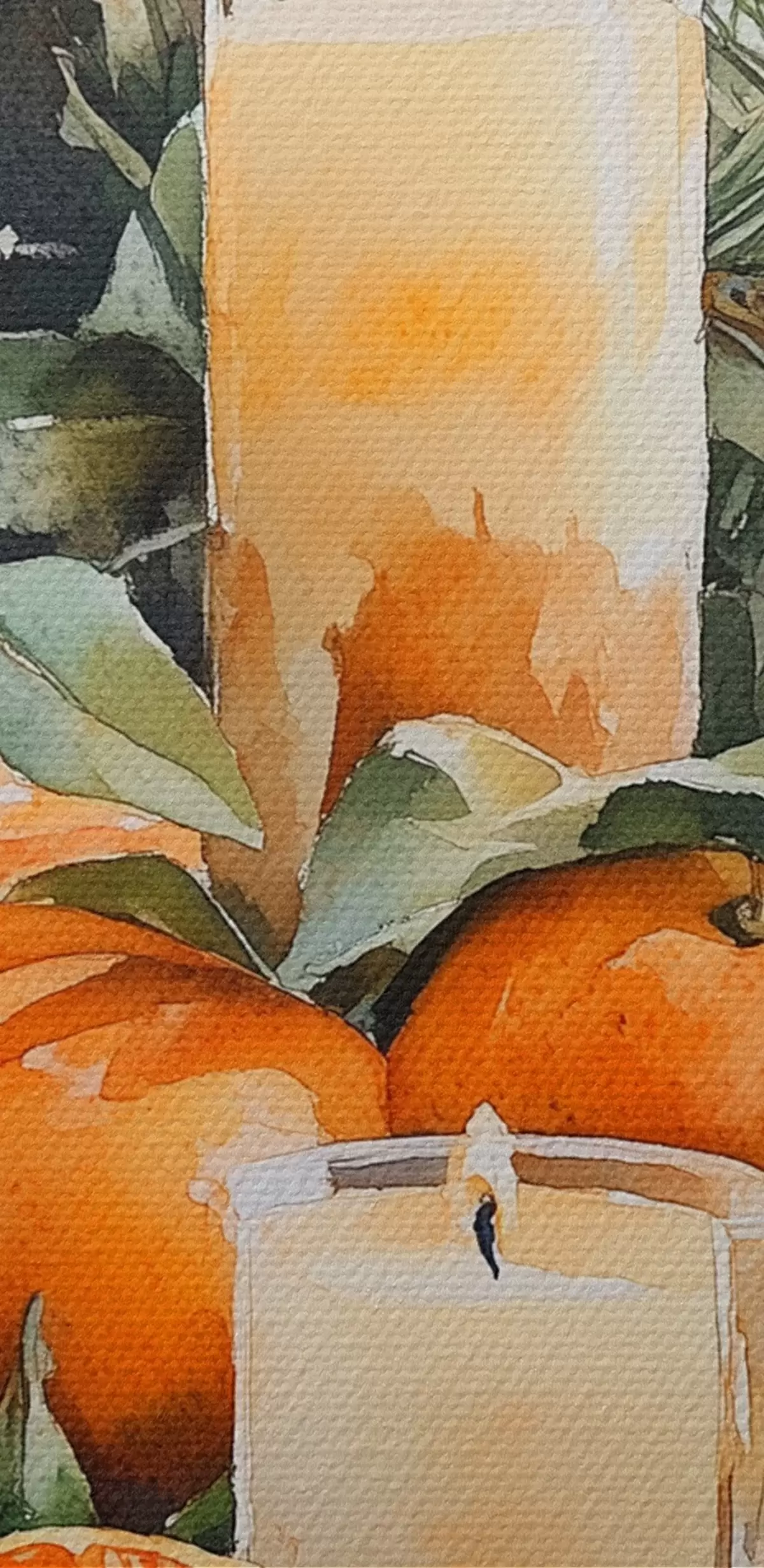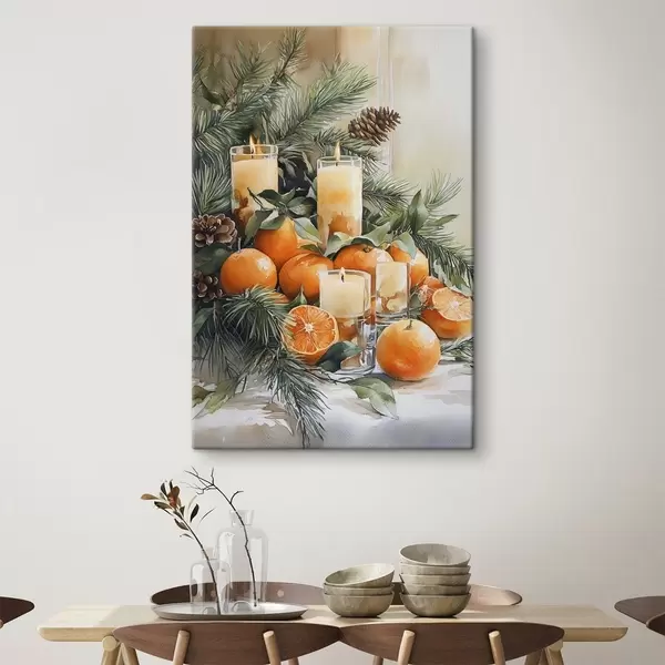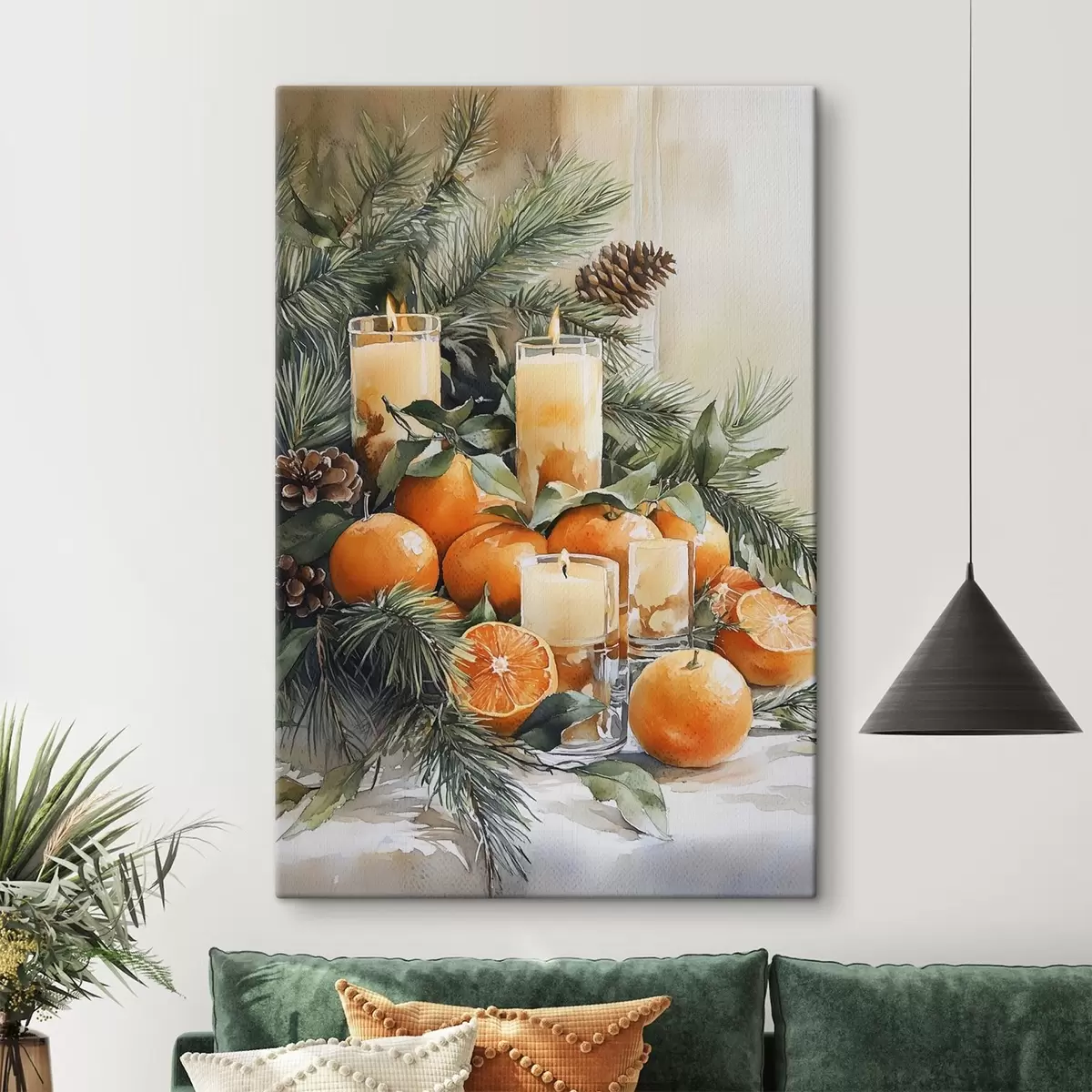 Peinture Branches de pin avec cônes, oranges et bougies, festif, style aquarelle Art. s41956