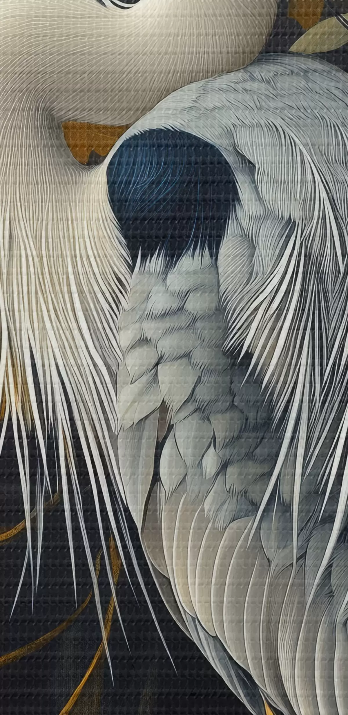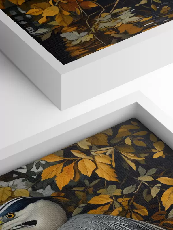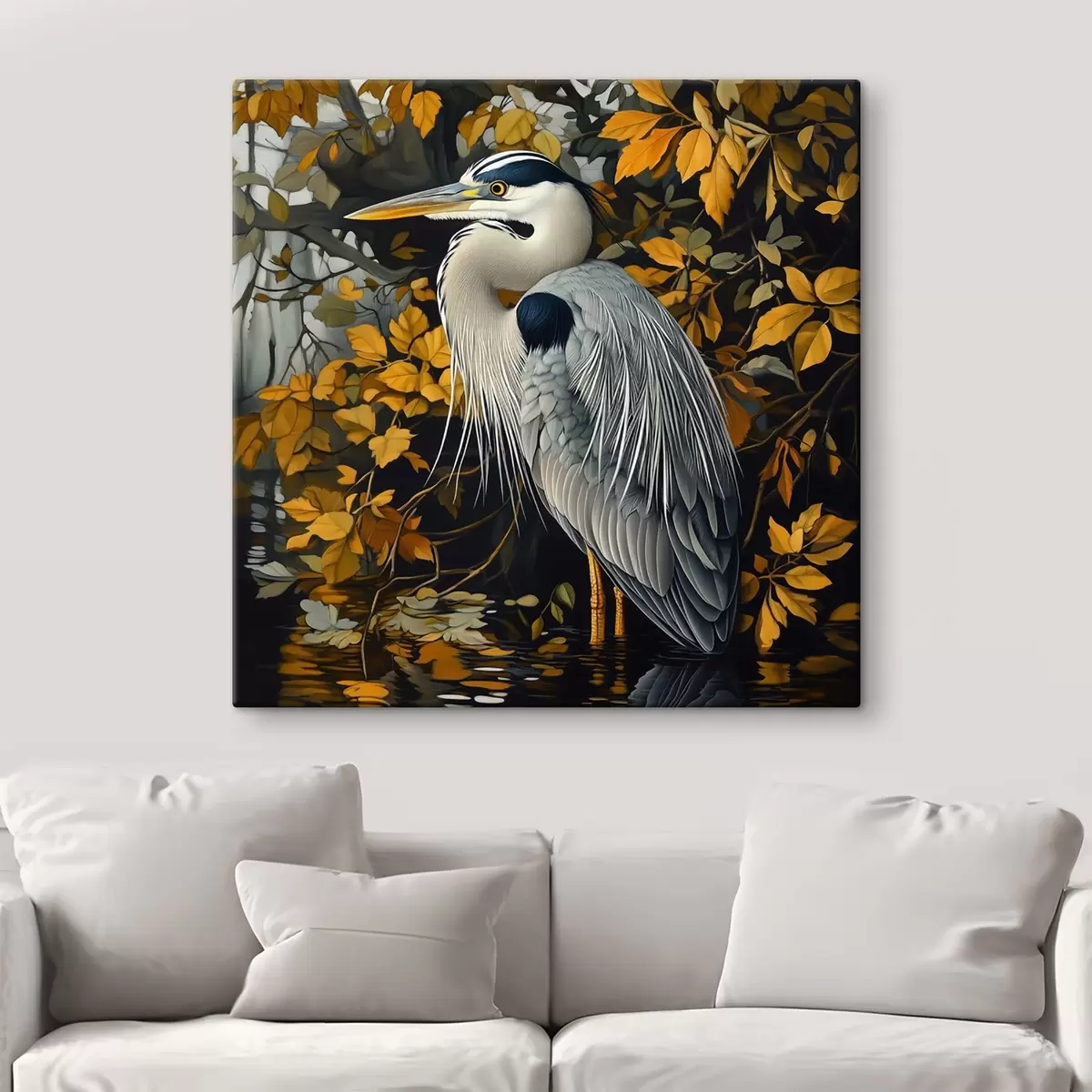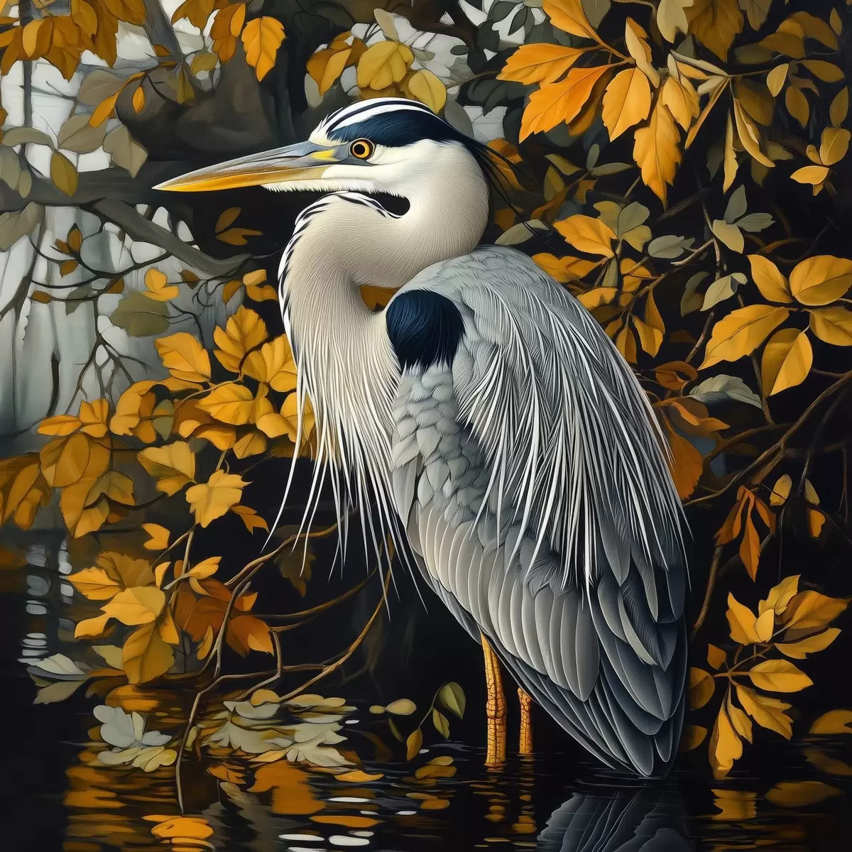 Peinture Héron dans l'eau sur fond de feuilles d'automne Art. s42041