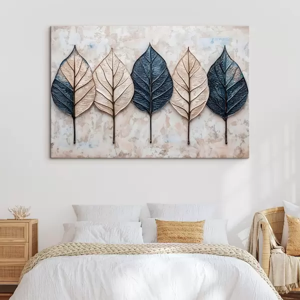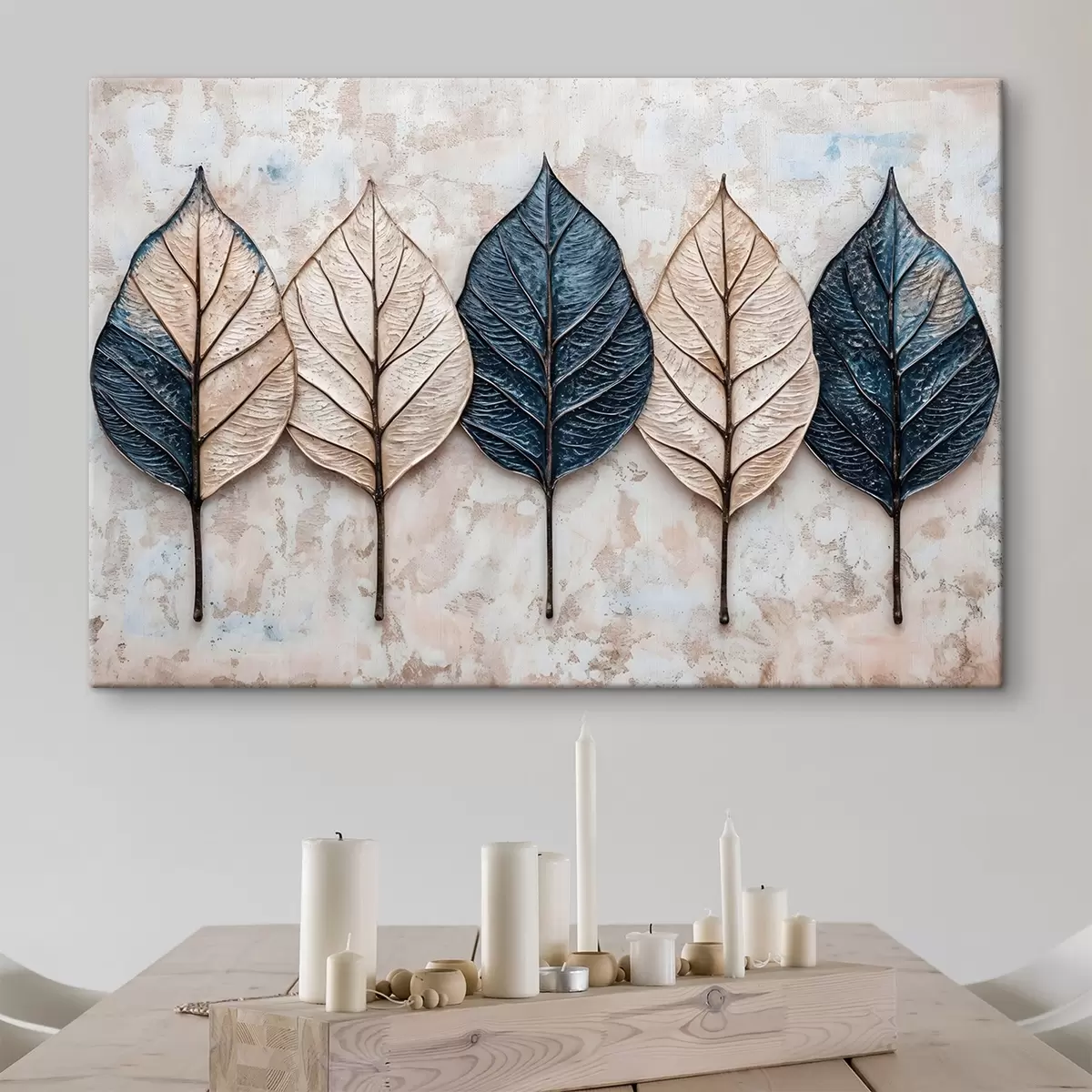 Peinture Feuilles d'automne abstraites assorties dans différentes nuances de brun, de beige et de bleu, disposées en rang sur un fond clair Art. s42217