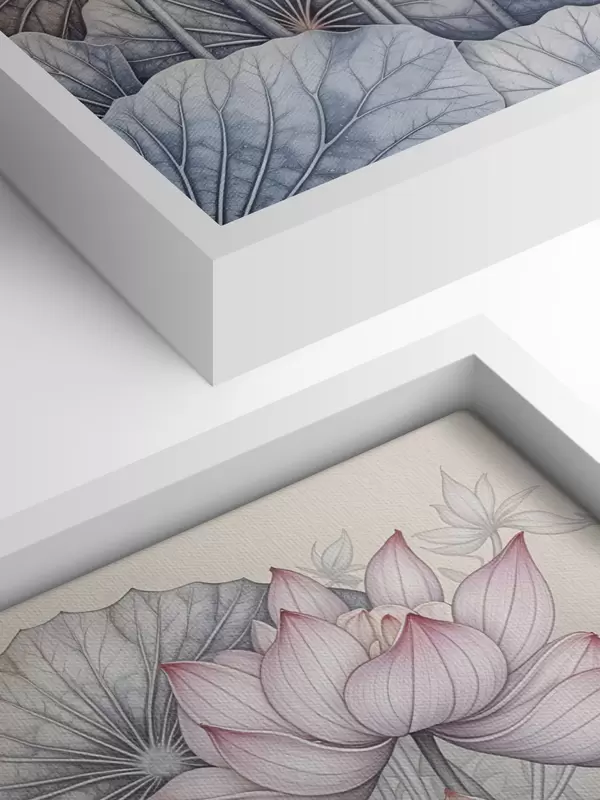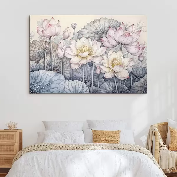 Peintures Grandes fleurs de lotus roses et blanches avec des feuilles et des tiges vertes sur un fond clair avec des pétales et des centres détaillés s42221